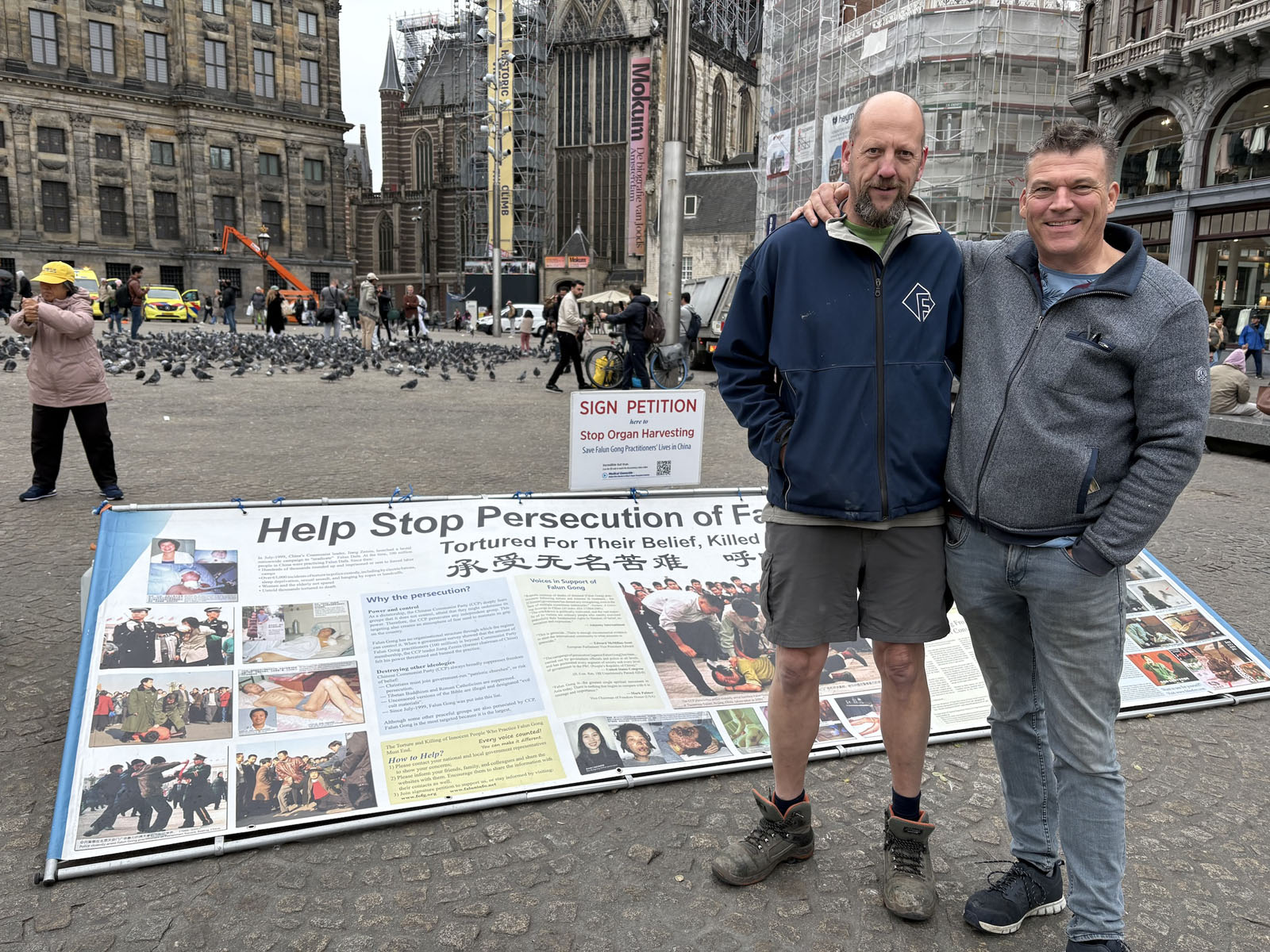 在阿姆斯特丹的法轮大法真相信息日活动中,两位荷兰公民:质量监控员埃尔文·博文 (Erwin Boven) 和负责房屋清理的企业主约翰·范·巴列戈伊恩 (John van Ballegooijen)停下来与法轮功学员交谈,了解更多关于法轮功在中国遭受迫害的情况。