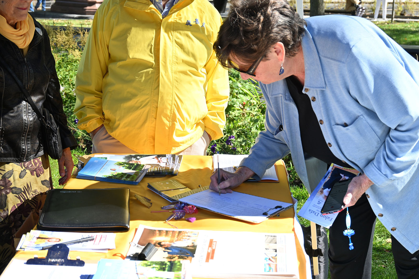 法轮功学员娜塔莉(Nathalie)很高兴参加此次活动,鼓励人们在请愿书上签名。对她来说,法轮大法和神韵艺术团都非常重要。她说:“人们不希望这里发生迫害。”