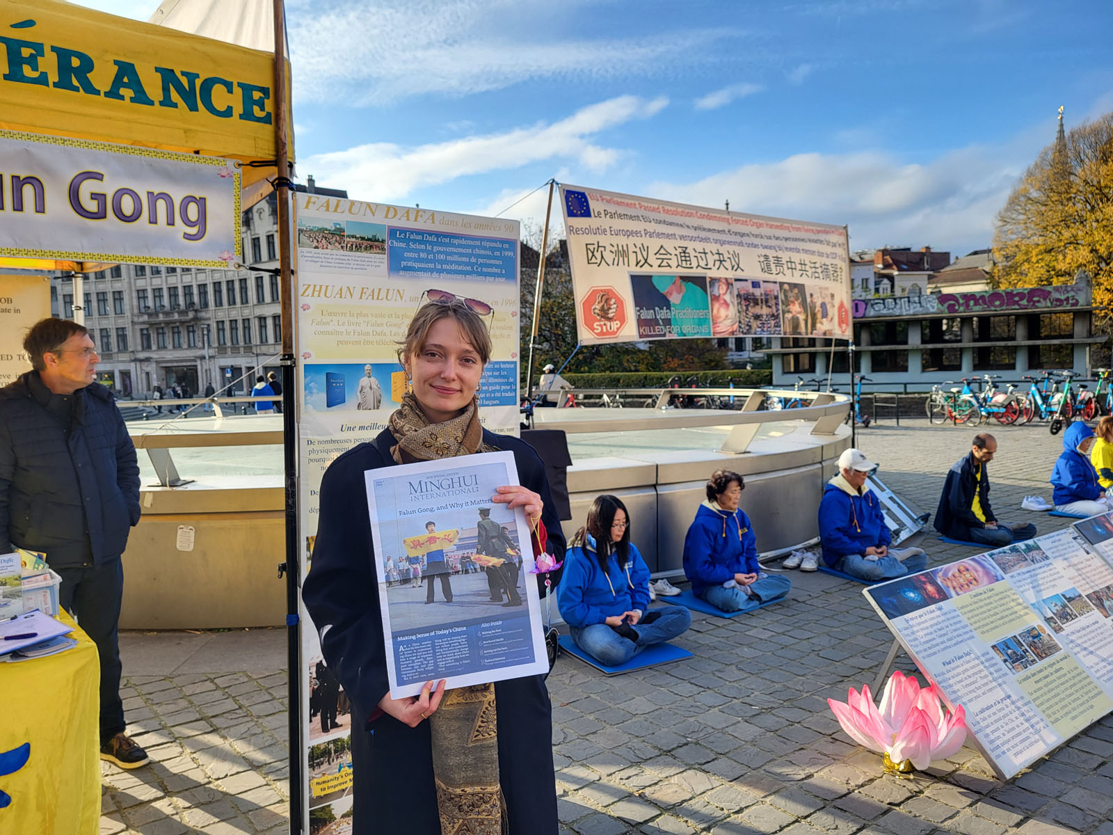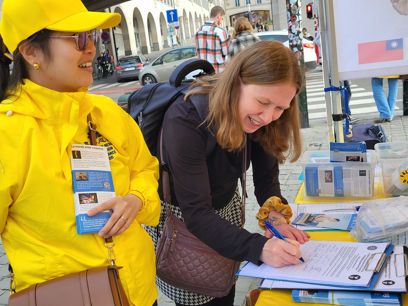 在法国文化与国际交流协会工作的玛琳(Marine)与学员交谈许久。她非常希望了解法轮功及发生的迫害。她和朋友周末来比利时度假,他们第一次得知这场迫害,当读了横幅和展板上写的中共迫害法轮功的讯息,玛琳觉得自己应该做点什么,哪怕只是签名支持。她说,让更多的人来了解发生的迫害是非常重要,“我的工作关系我希望了解更多的讯息,能让更多的人来参与反迫害签名。”