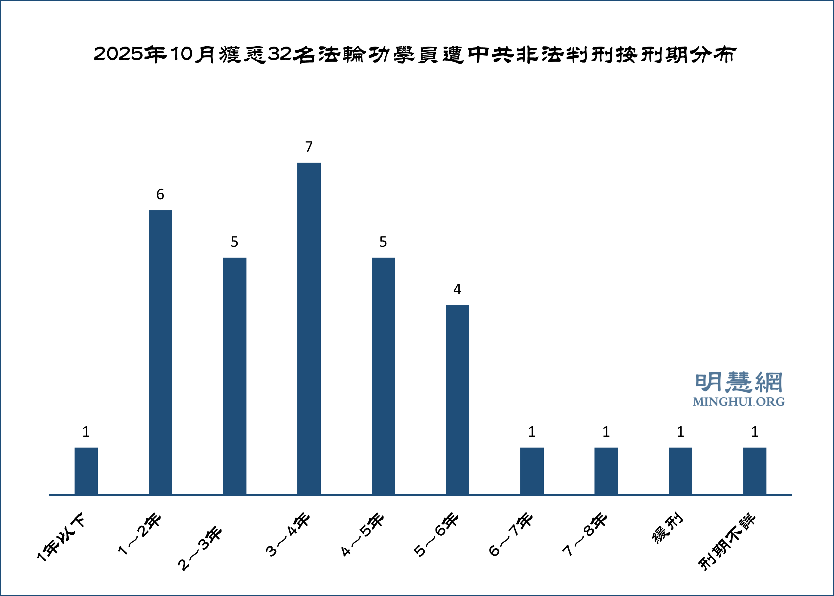 图2:2025年10月获悉32名法轮功学员遭中共非法判刑按刑期分布