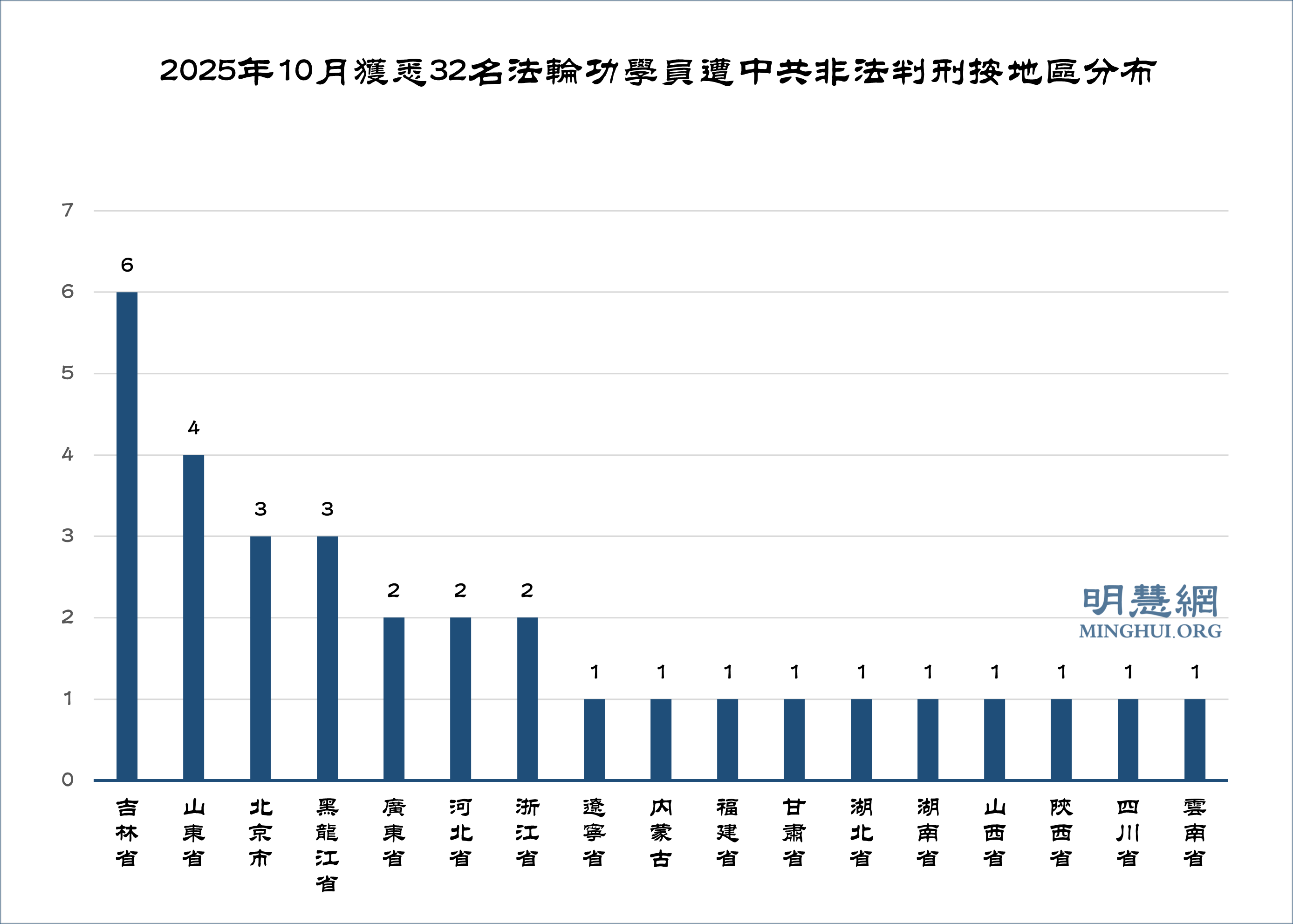 【明慧网二零二五年十一月五日】(明慧网通讯员中国大陆报道)据明慧网报道统计,今年十月份获知又有32名法轮功学员被非法判刑;有17个省、自治区、直辖市参与迫害。迫害最严重地区依次为:吉林省6人,山东省4人;北京市、黑龙江省各3人;广东省、河北省、浙江省各2人。非法判刑最长刑期7年,最短刑期8个月。年龄最长者77岁,最小者48岁,其中,40~50岁 1人,50~60岁8人,60~70岁6人,70~80岁9人。