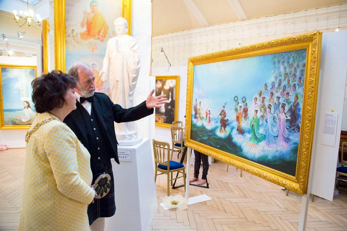 ![]() 图3:2013年艾迪(右)向格拉斯哥市长介绍真善忍画展。 |