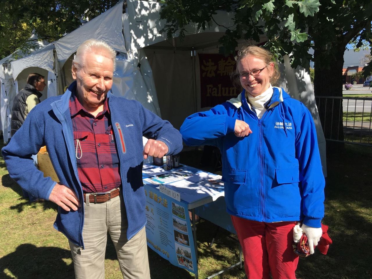 ![]() 图1:九十四岁的亨利-保罗·彼内特(左)与孙女在魁北克维多利亚城(Victoriaville)和平节上参加弘法活动。 |