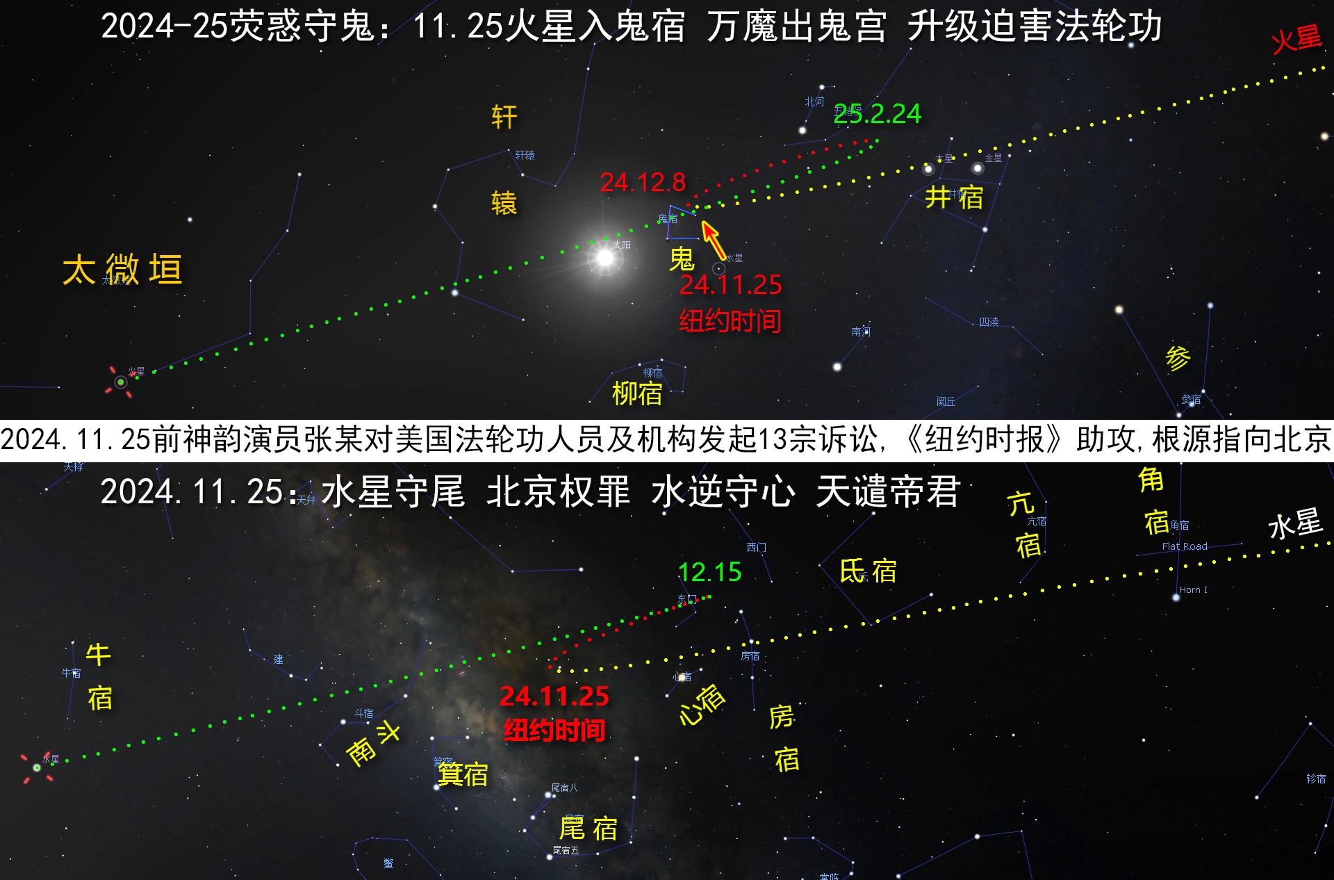 2024年11月25日,火星进入鬼宿四星之宫。鬼宿宫群魔再次形成了一个凶险天象的时间点,与祸国殃民的“无产阶级文化大革命”发生时的天象极为相似。这一天,张某告陷法轮功创始人李洪志老师、反告母校、告陷自己的老师,告陷给她花费了巨额资金和心血,培养她成材的神韵艺术团,这难免不让人想起,在1966年中共发动的那场“无产阶级文化大革命”运动中,学生揪斗和殴打自己的老师。