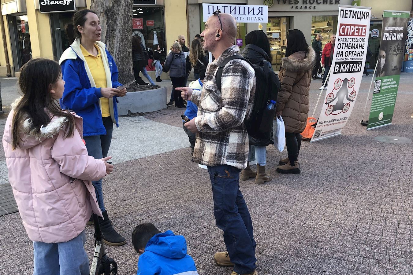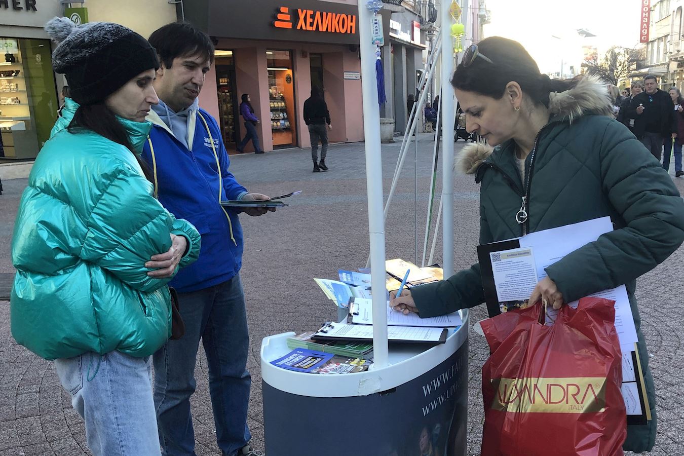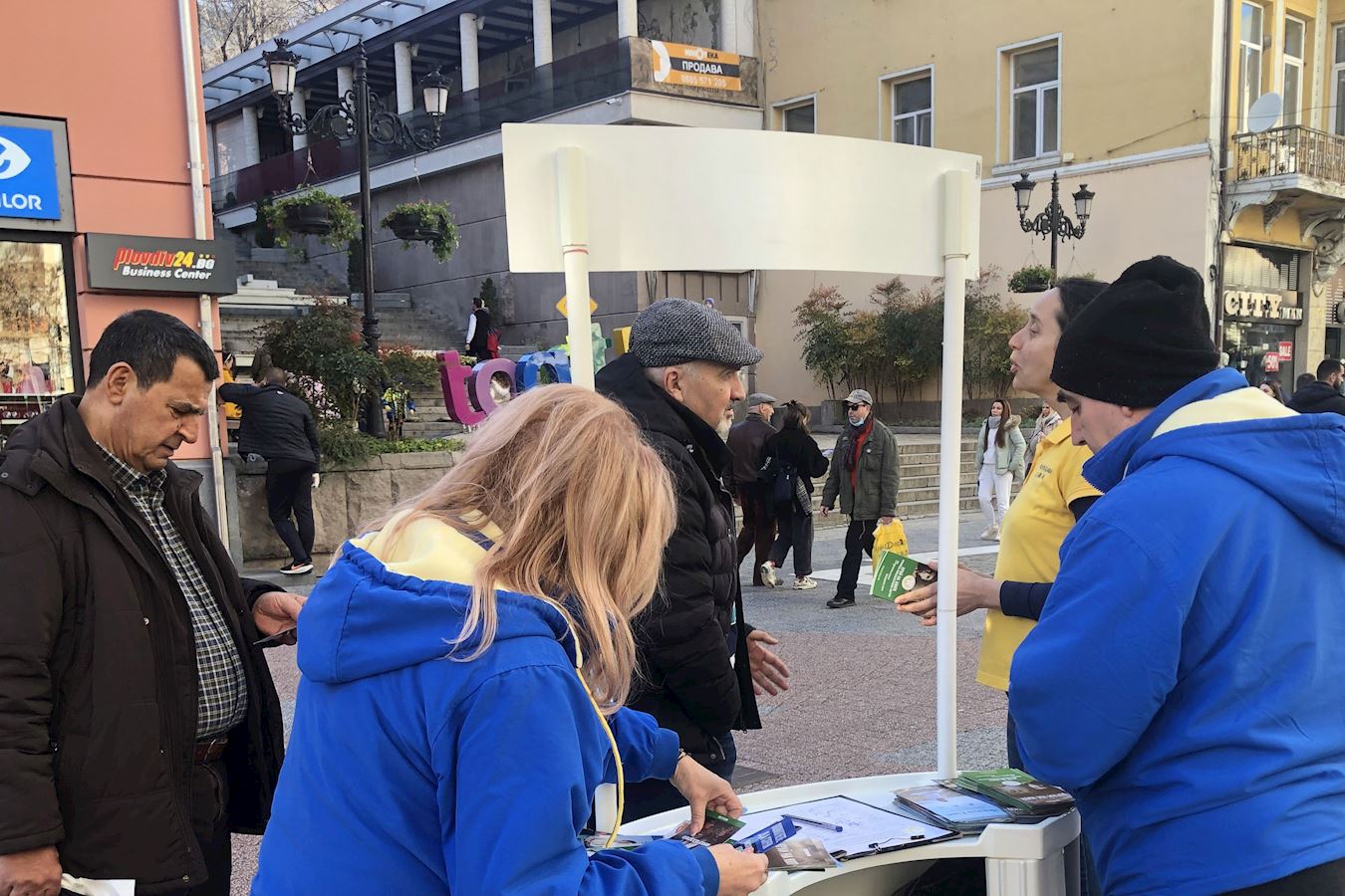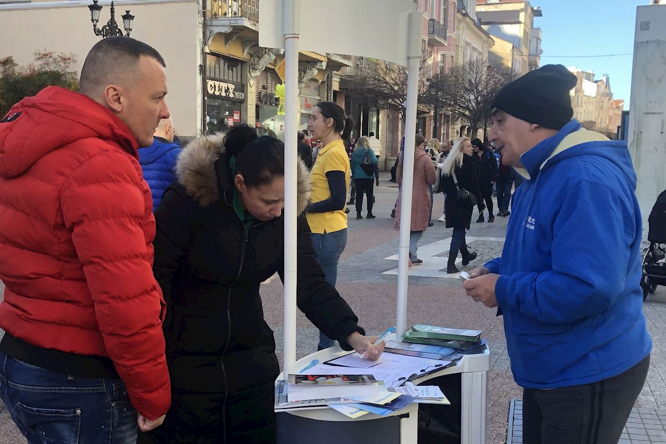 一月二十五日,在普罗夫迪夫卡梅尼察楼梯对面的主步行街一个繁华地段,来自保加利亚南部地区的法轮功学员设立信息亭,向当地民众和游客传递法轮功真相。