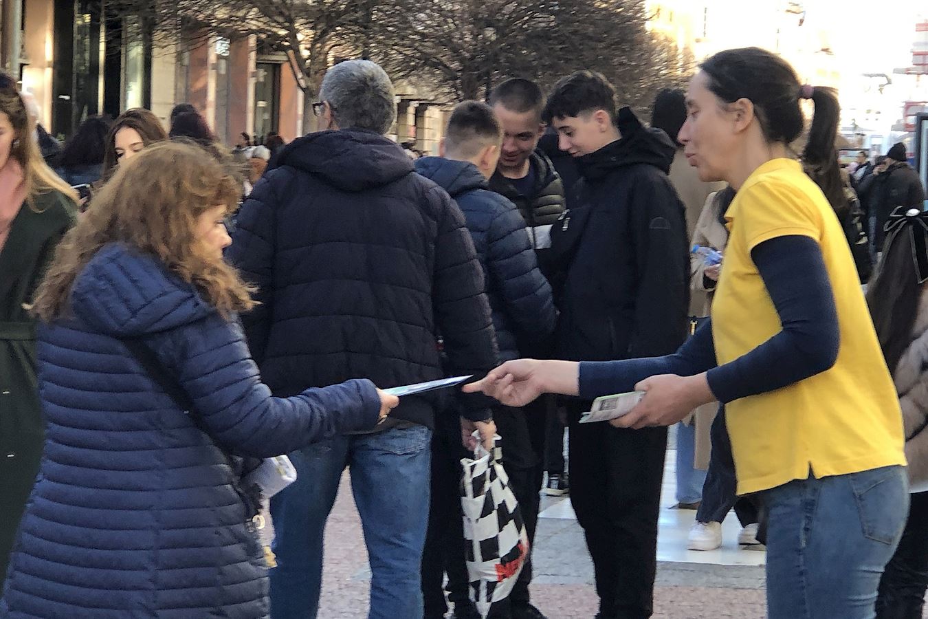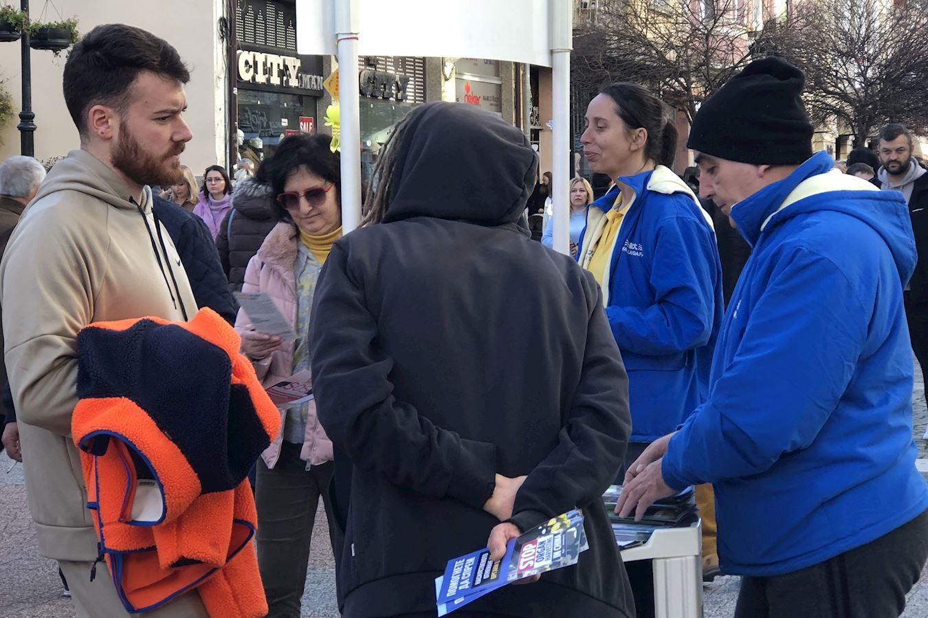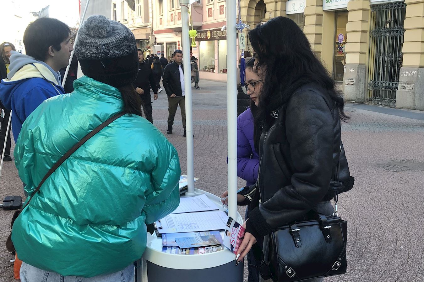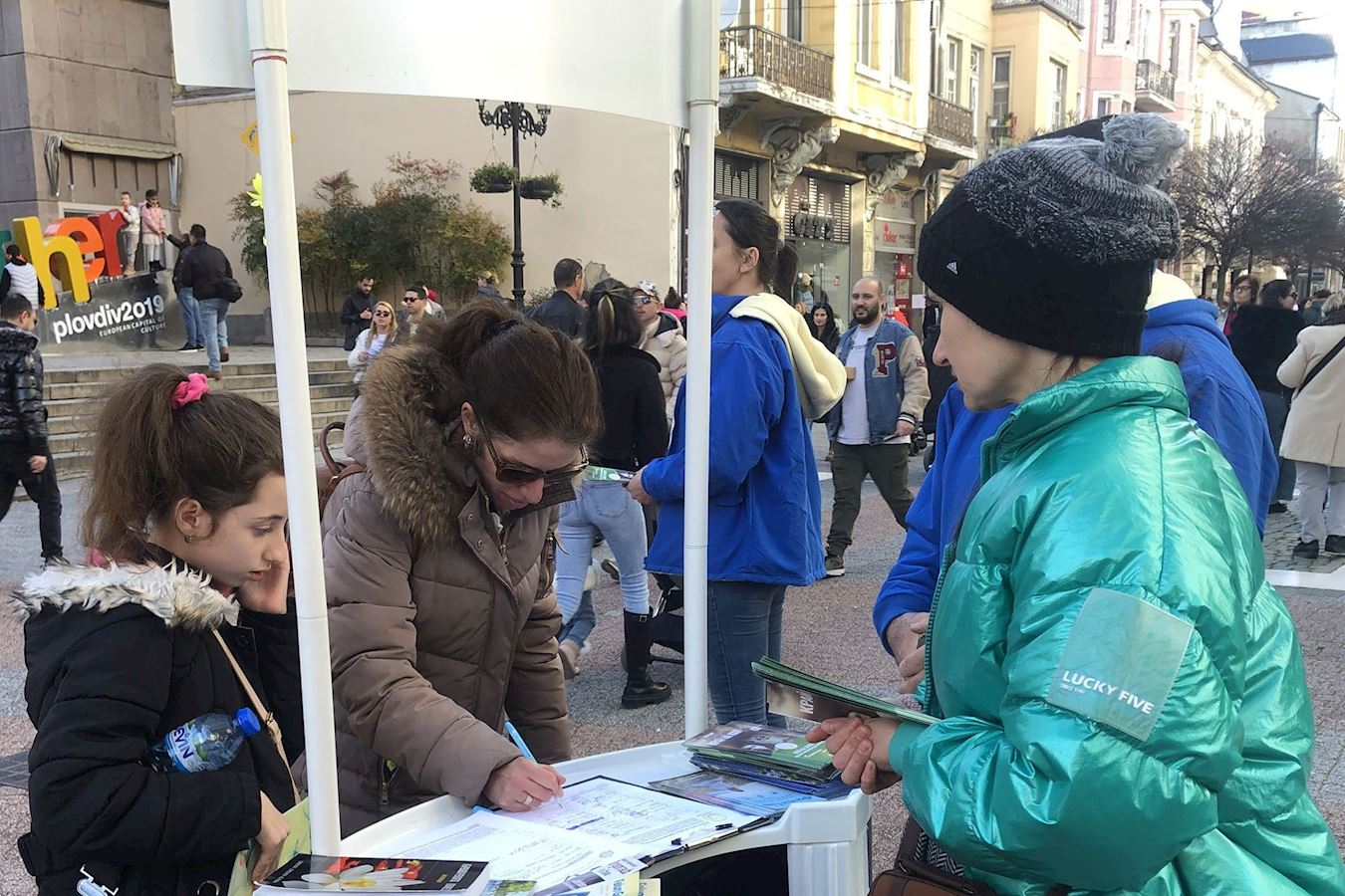 一月二十五日,在普罗夫迪夫卡梅尼察楼梯对面的主步行街一个繁华地段,来自保加利亚南部地区的法轮功学员设立信息亭,向当地民众和游客传递法轮功真相。