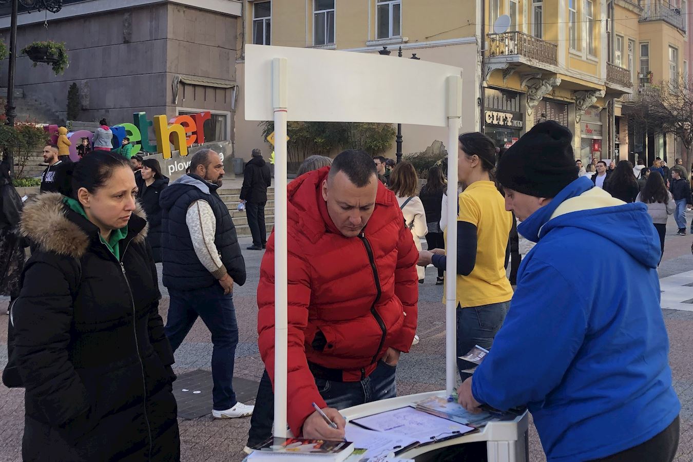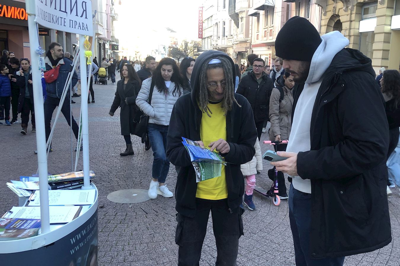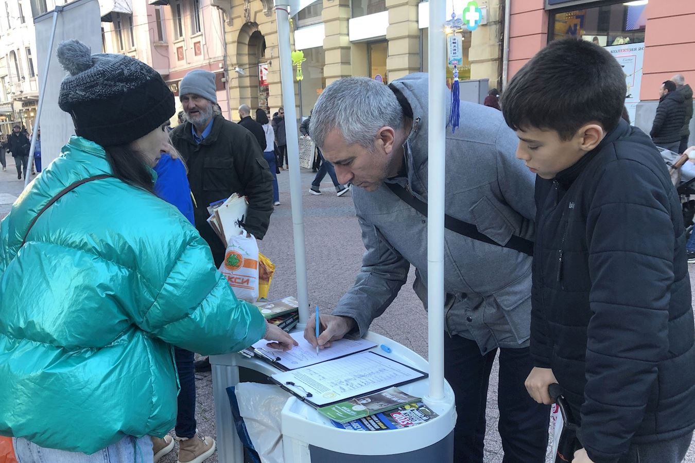 来自保加利亚的城镇奇尔潘(Chirpan)的一位名叫迪诺唷(Dinyo)的男士坐在展台后面仔细阅读了整本真相小册子,然后在请愿书上签名。一位女学员问他是不是本地人,迪诺唷恰巧来自于这位学员的家乡,学员表示正打算回家乡举办讲真相和征签活动。迪诺唷对这一请愿活动的严肃性和独特性深感触动,他和这位学员互留了联络方式,因为他打算在这位学员回家乡办活动时带上他的朋友和同事也在请愿书上签名。