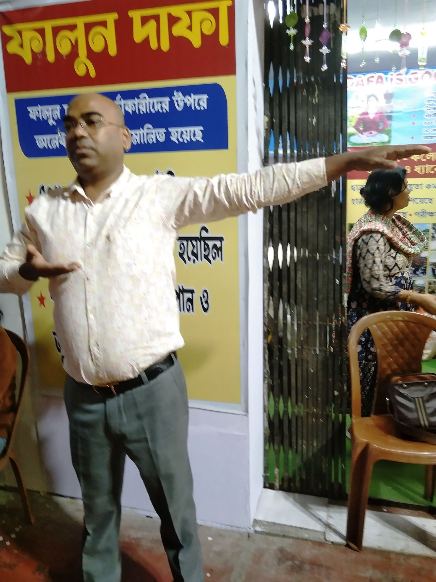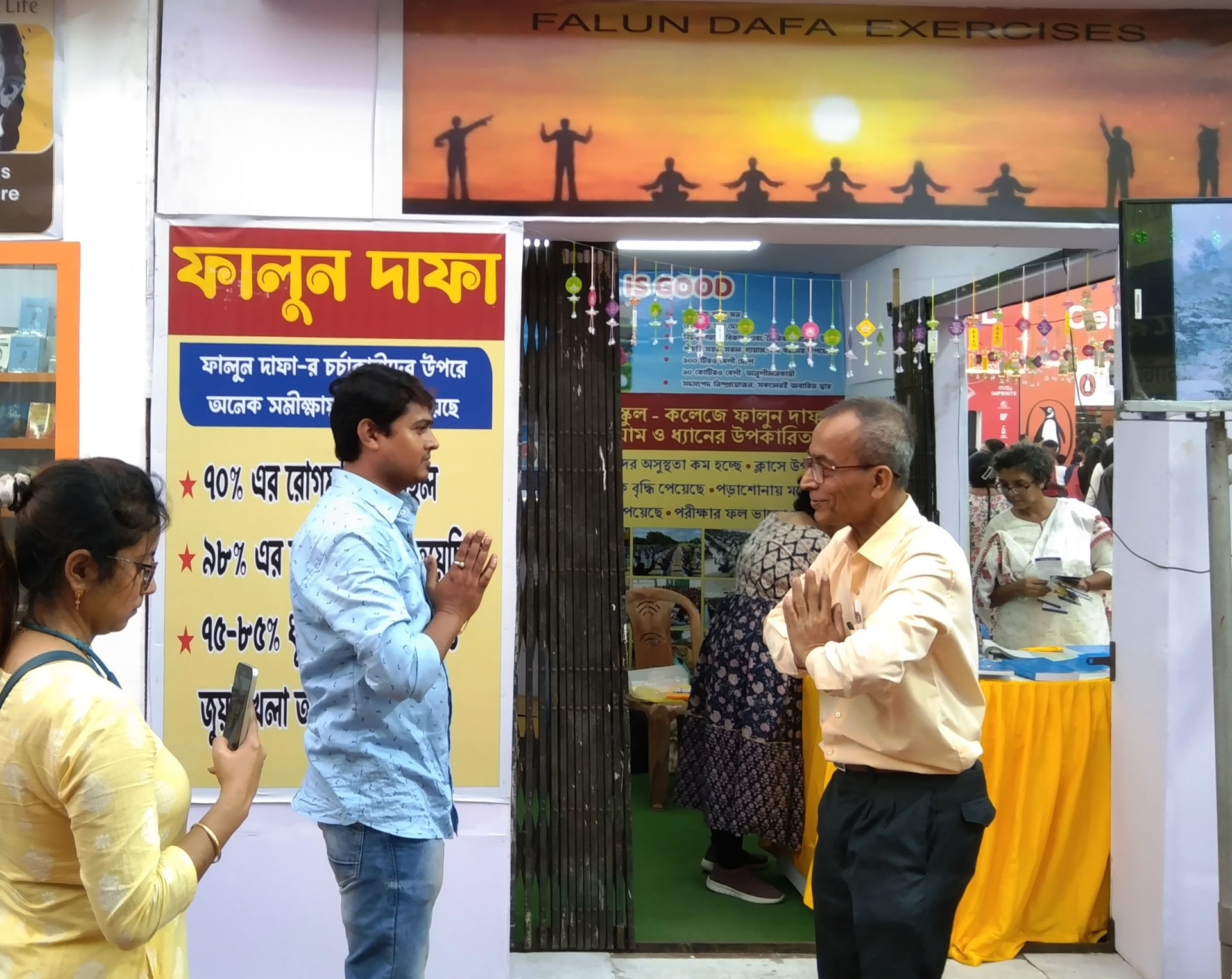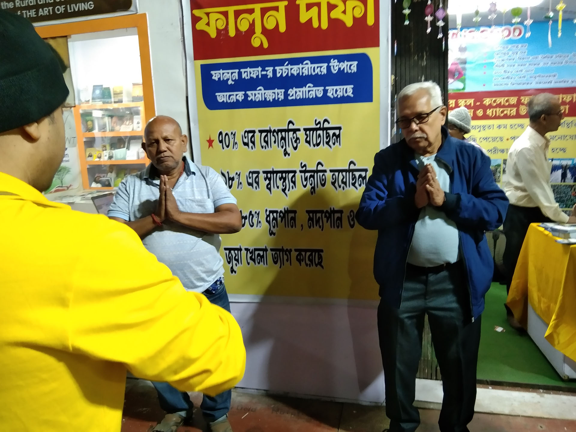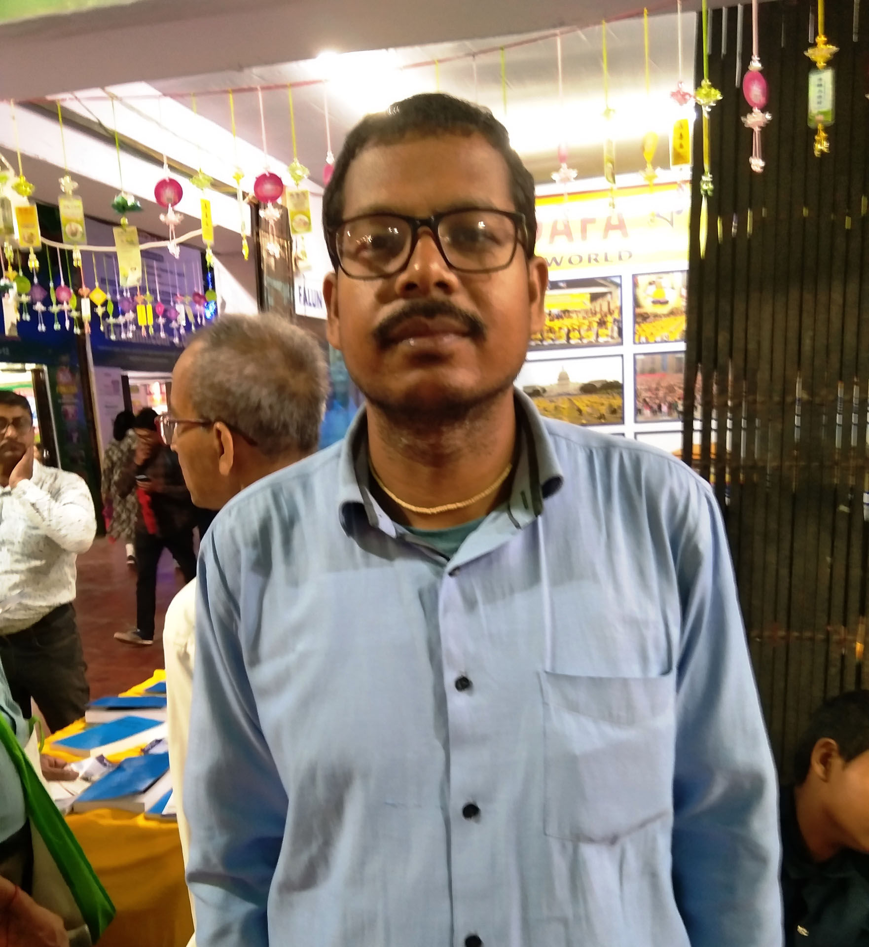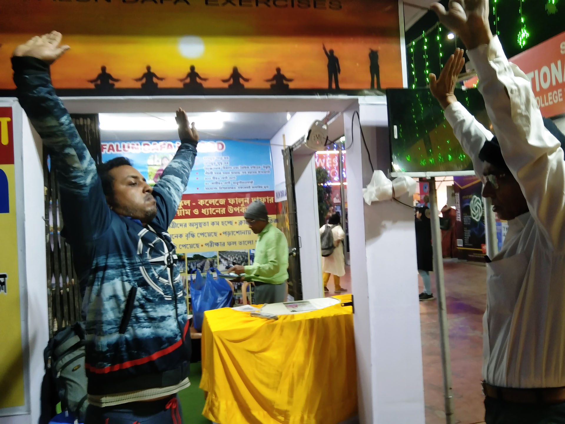 他教41岁的桑乔伊·普拉凯特(Sanjoy Purakait)学习功法,桑乔伊是一名政府学校教师,这次是和儿子一起来书展的。阿莱还向他强调,每天阅读《转法轮》并按照书中的原理生活非常重要。