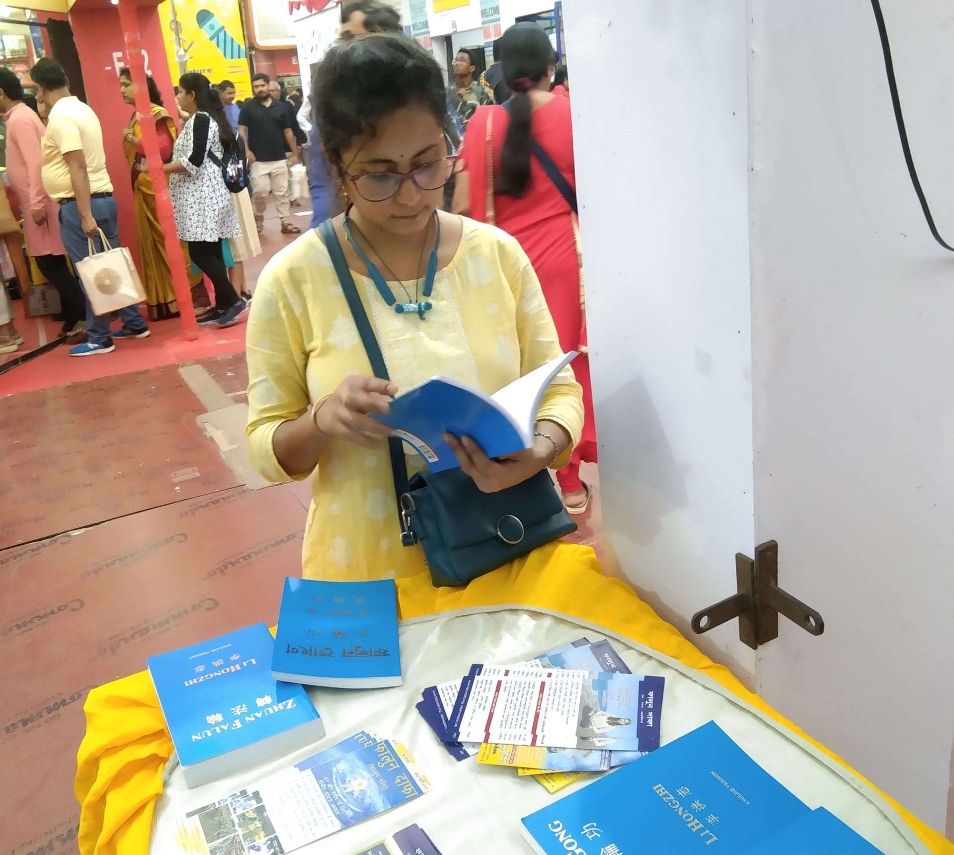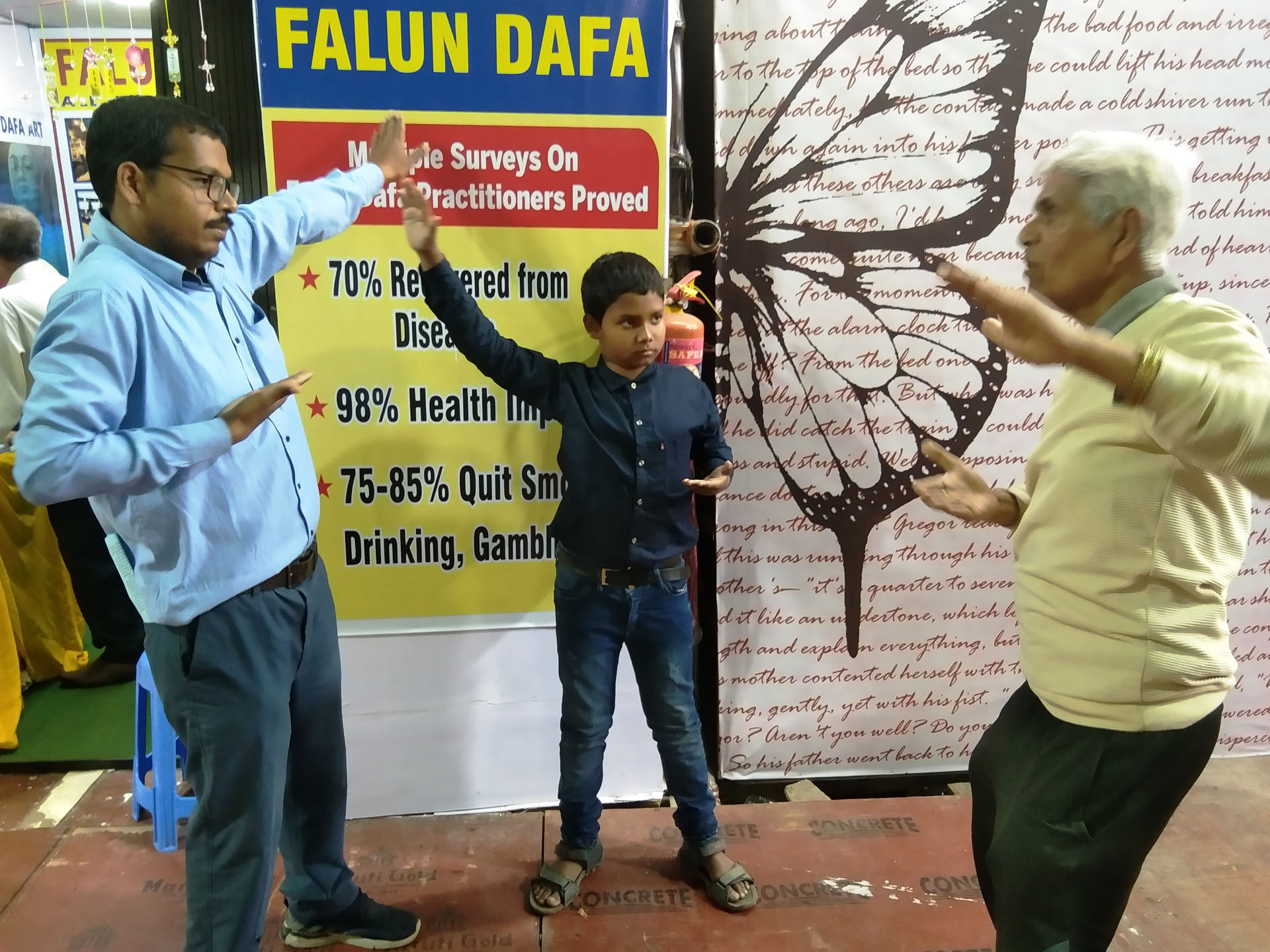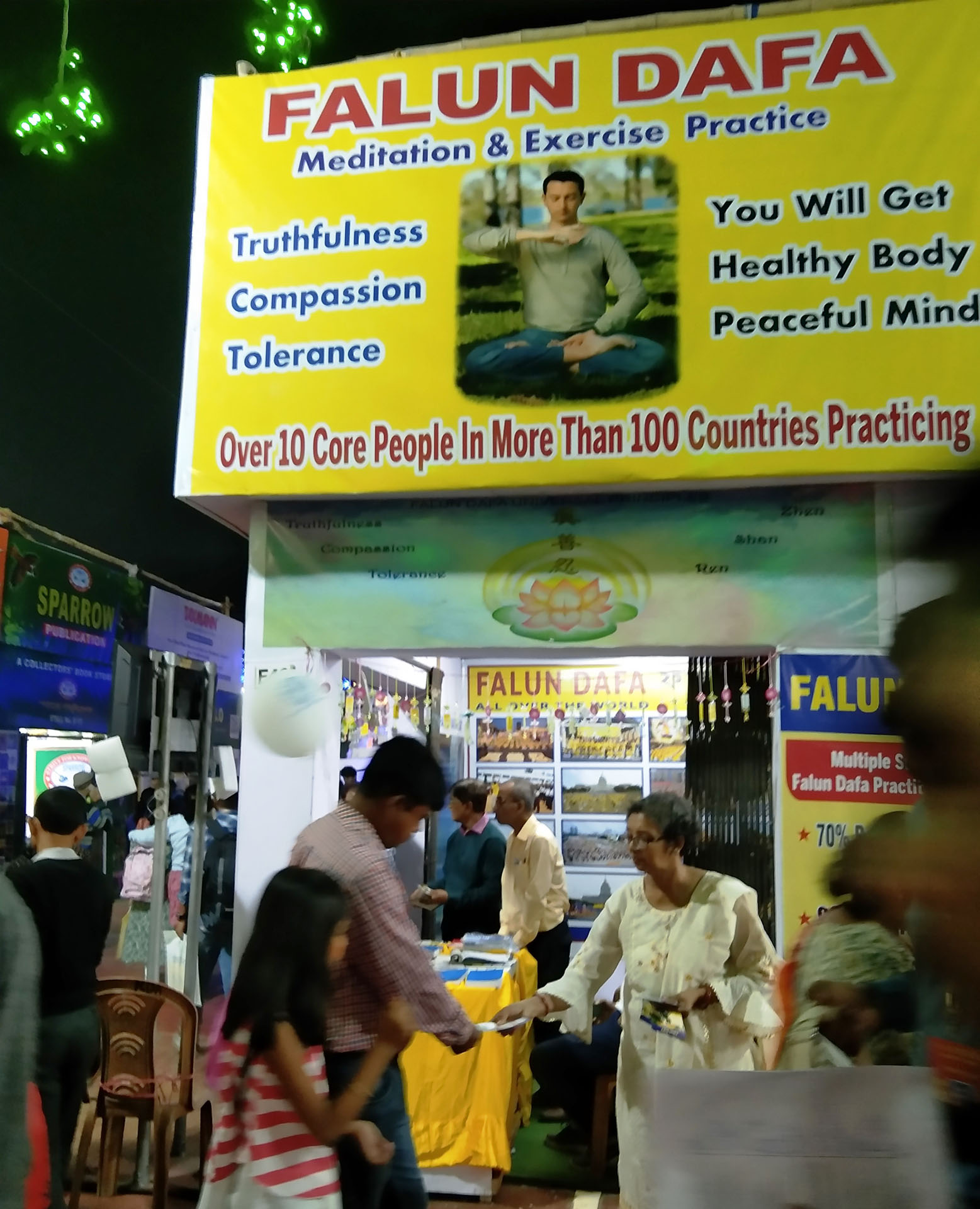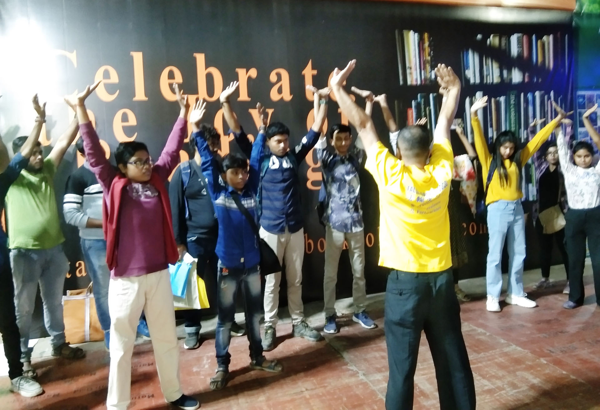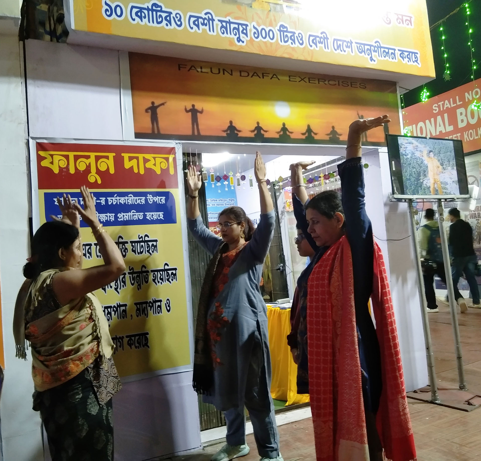 他教41岁的桑乔伊·普拉凯特(Sanjoy Purakait)学习功法,桑乔伊是一名政府学校教师,这次是和儿子一起来书展的。阿莱还向他强调,每天阅读《转法轮》并按照书中的原理生活非常重要。