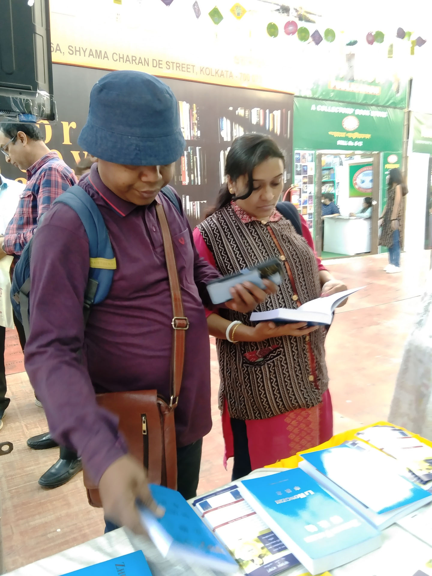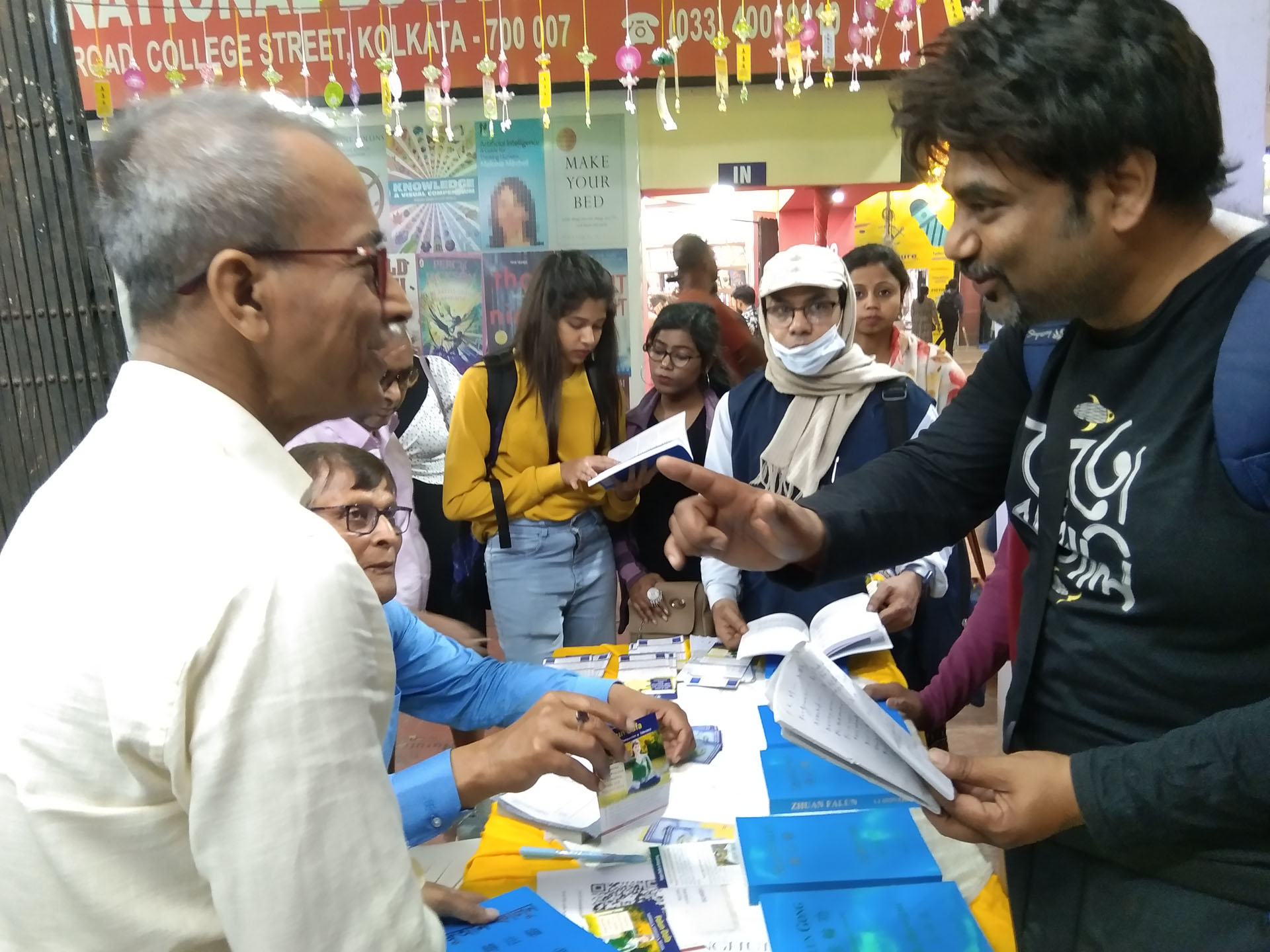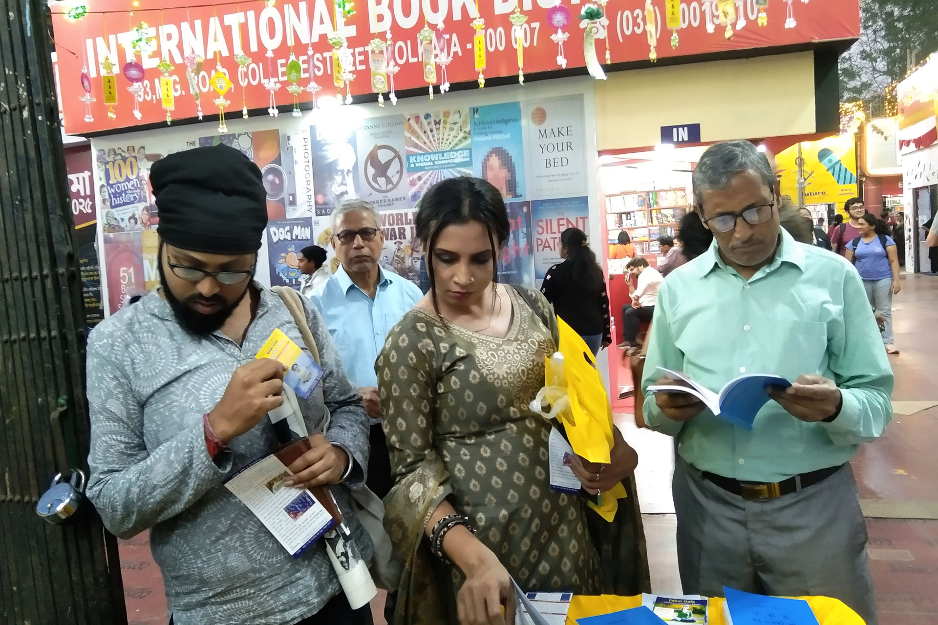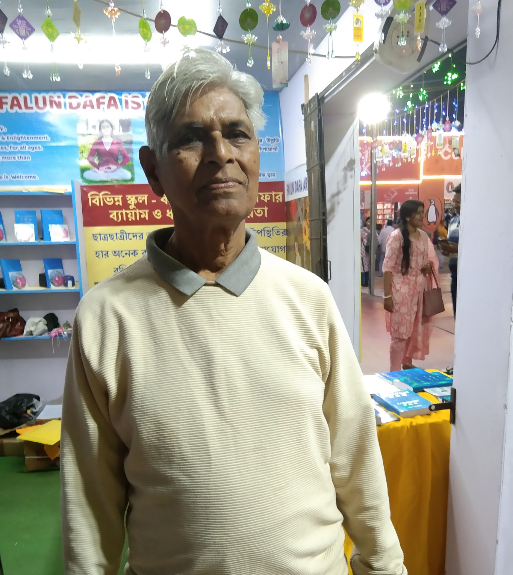 两位七十多岁的朋友沙尚克·森(Shashank Sen)和P·塔卢克达(P. Talukdar)一同参观了书展,同行的还有塔卢克达的女儿,她从德国回国度假。塔卢克达曾向女儿展示过《转法轮》的孟加拉语版本,当她得知法轮大法在加尔各答有人修炼后非常兴奋。为此,他特意来到书展,为女儿购买一本英文版的《转法轮》。