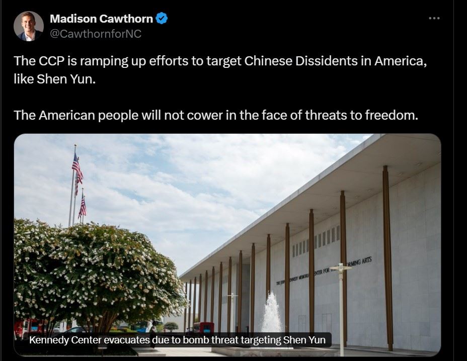 美国德州国会众议员兰斯·古登(Lance Gooden)二月二十一日发文说:“中共一直无耻地向全球神韵(演出剧场)发出炸弹威胁。昨天在肯尼迪中心发出的毫无根据的炸弹威胁是又一次恐吓企图。中共的破坏活动不会得逞。神韵将继续展示不受共产主义影响的正宗中国文化!”