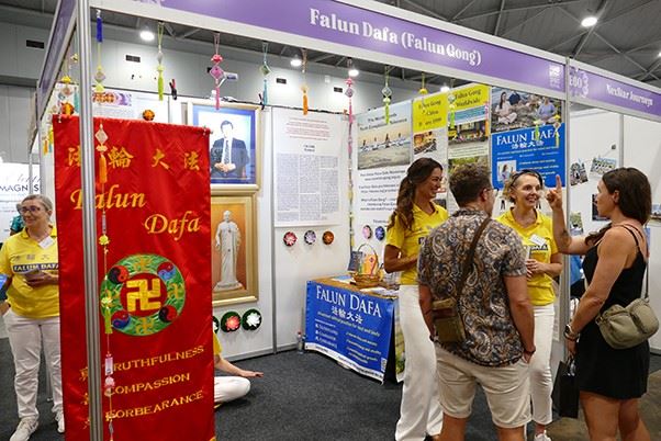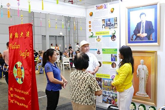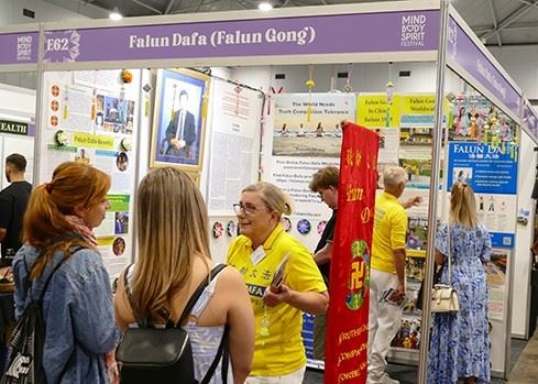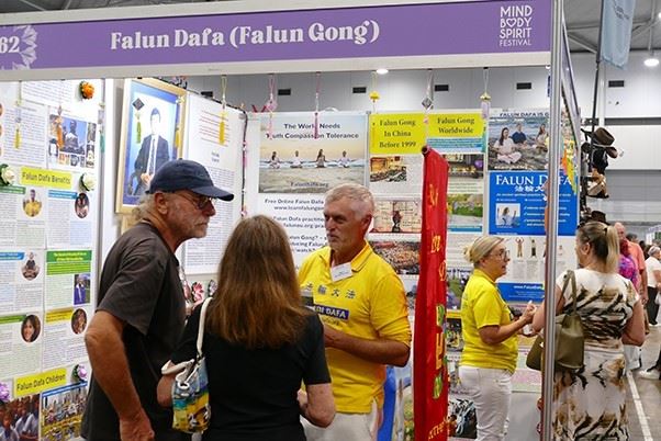 每年的身心灵节,法轮功学员的朋友都会来到展位聊天,共度美好时光。他们沐浴在法轮大法展台散发出的纯正能量中,热情地聊天,探索法轮功学员展示的法轮大法信息。