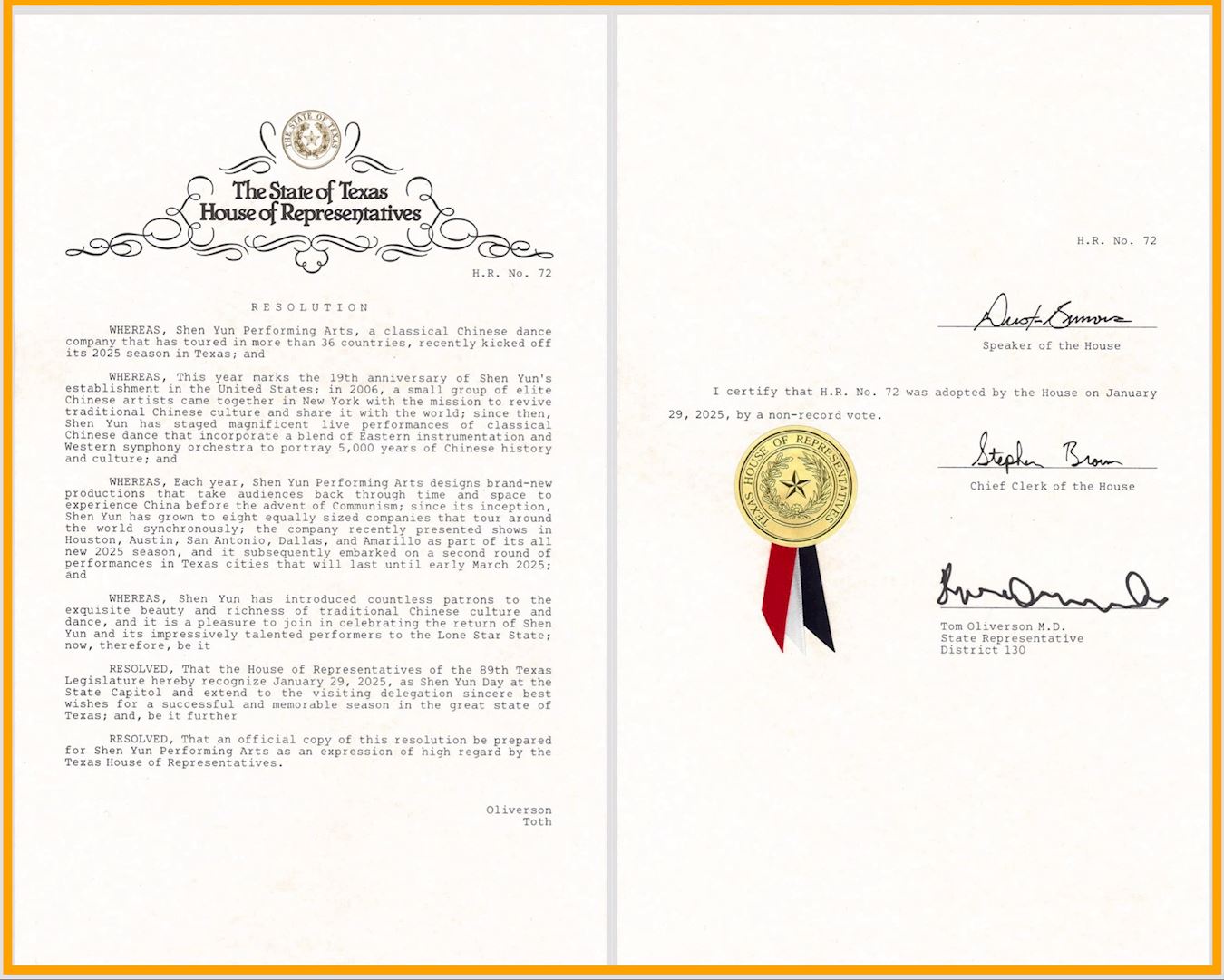 二零二五年一月二十九日,乙巳新年大年初一,美国德州众议院一致通过一项HR 72决议案,宣布将一月二十九日命名为德州“神韵日”(Shen Yun Day)。