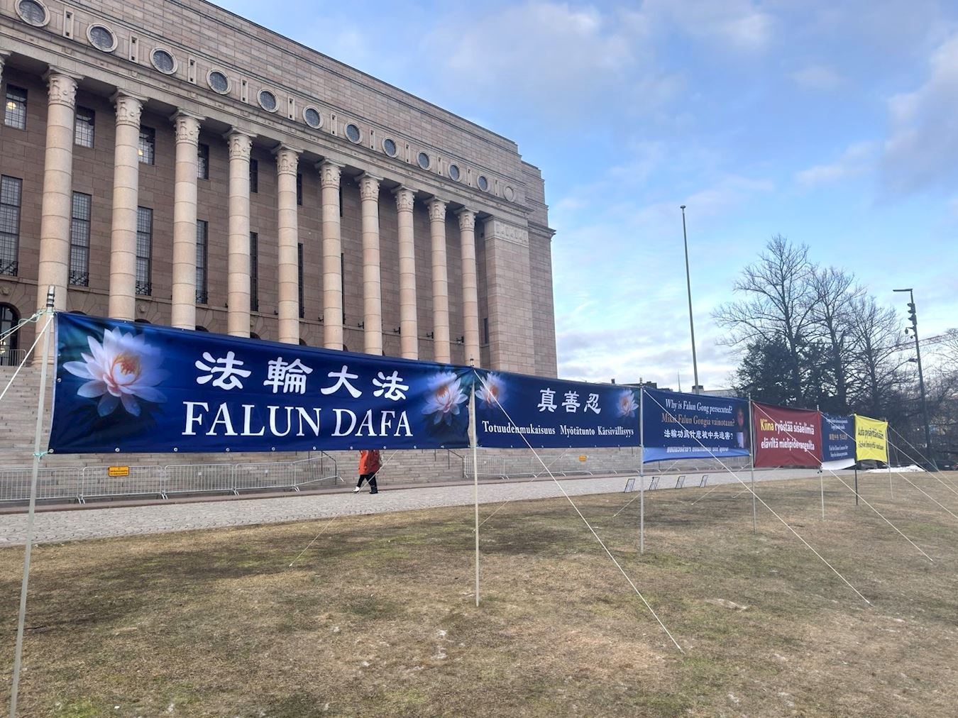 ![]() 图1:芬兰法轮功学员在议会大厦前竖起法轮大法横幅 |