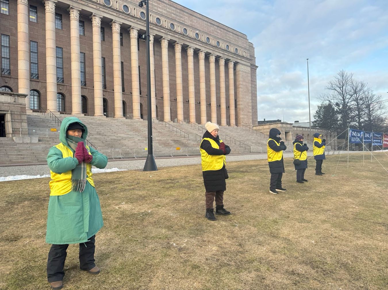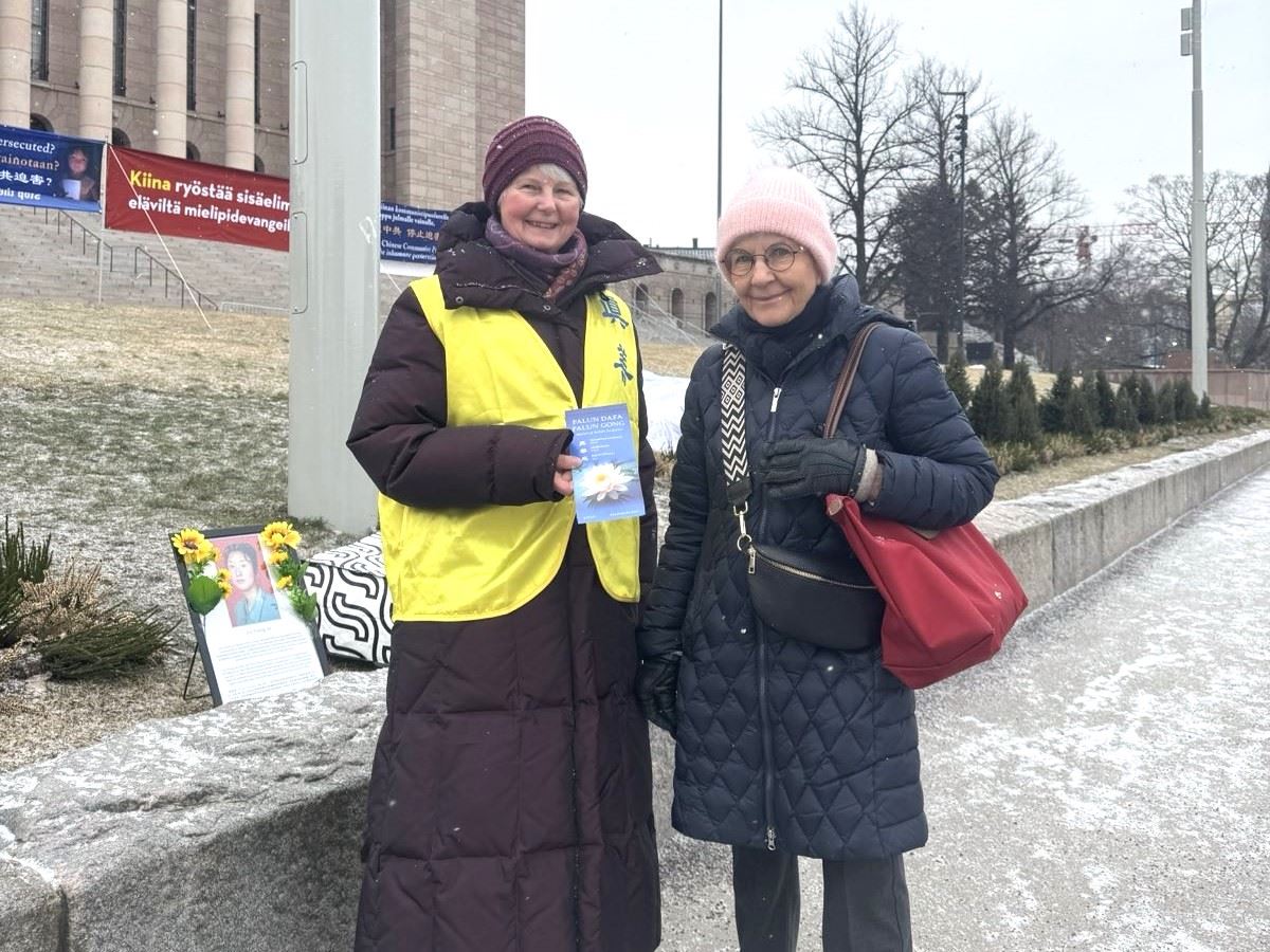 三位女士在议会大厦前,准备参加下午的集会。其中一位女士告诉学员,二十年前,她曾在在赫尔辛基的火车站看见法轮功学员办的活动,并拿了资料。回去后,她仔细研究,并了解到中共活摘法轮功学员器官的罪恶。她说:“你们做了一件非常重要的事情,应该在(议会大厦)这告诉更多的人。”