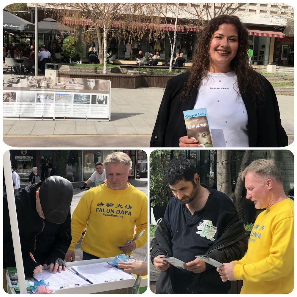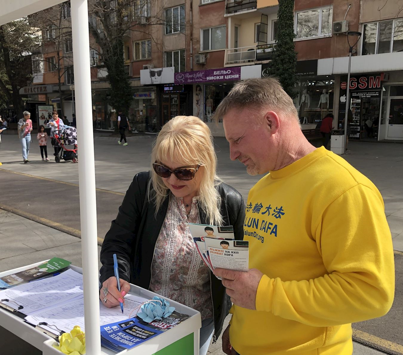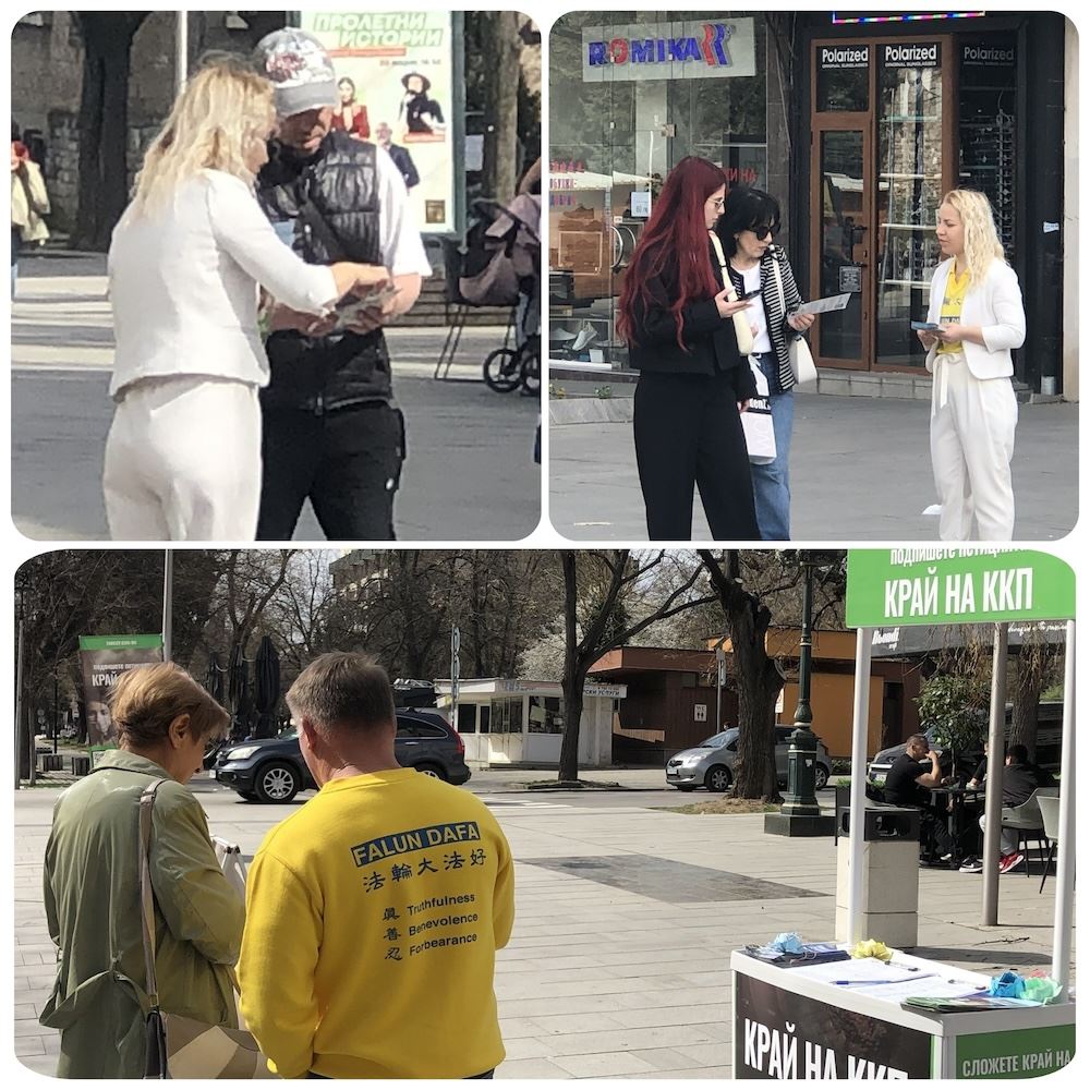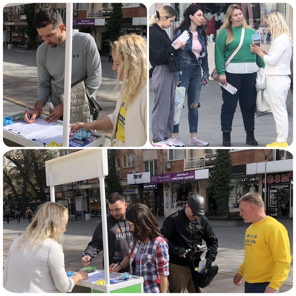 当天天气和煦温暖,法轮功学员在旧扎戈拉主街中心位置之一的百货商店前设立展位,众人纷纷驻足了解中共迫害的真相,并在两份请愿书上签名。一份谴责中共犯下的反人类暴行;另一份则聚焦于中共对法轮大法修炼者实施的活摘器官罪行,要求保加利亚政府确保其国民不参与这些犯罪行为。