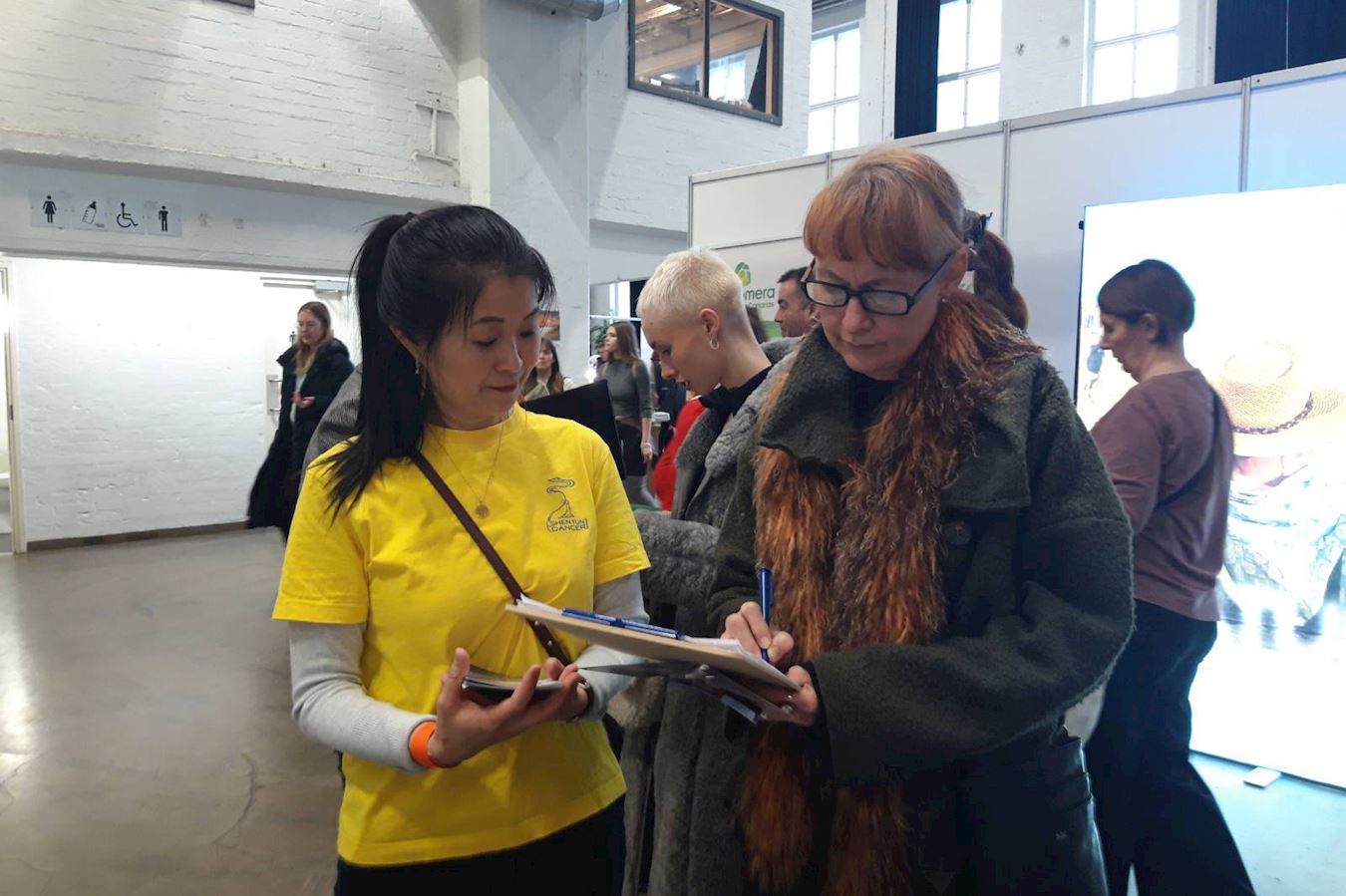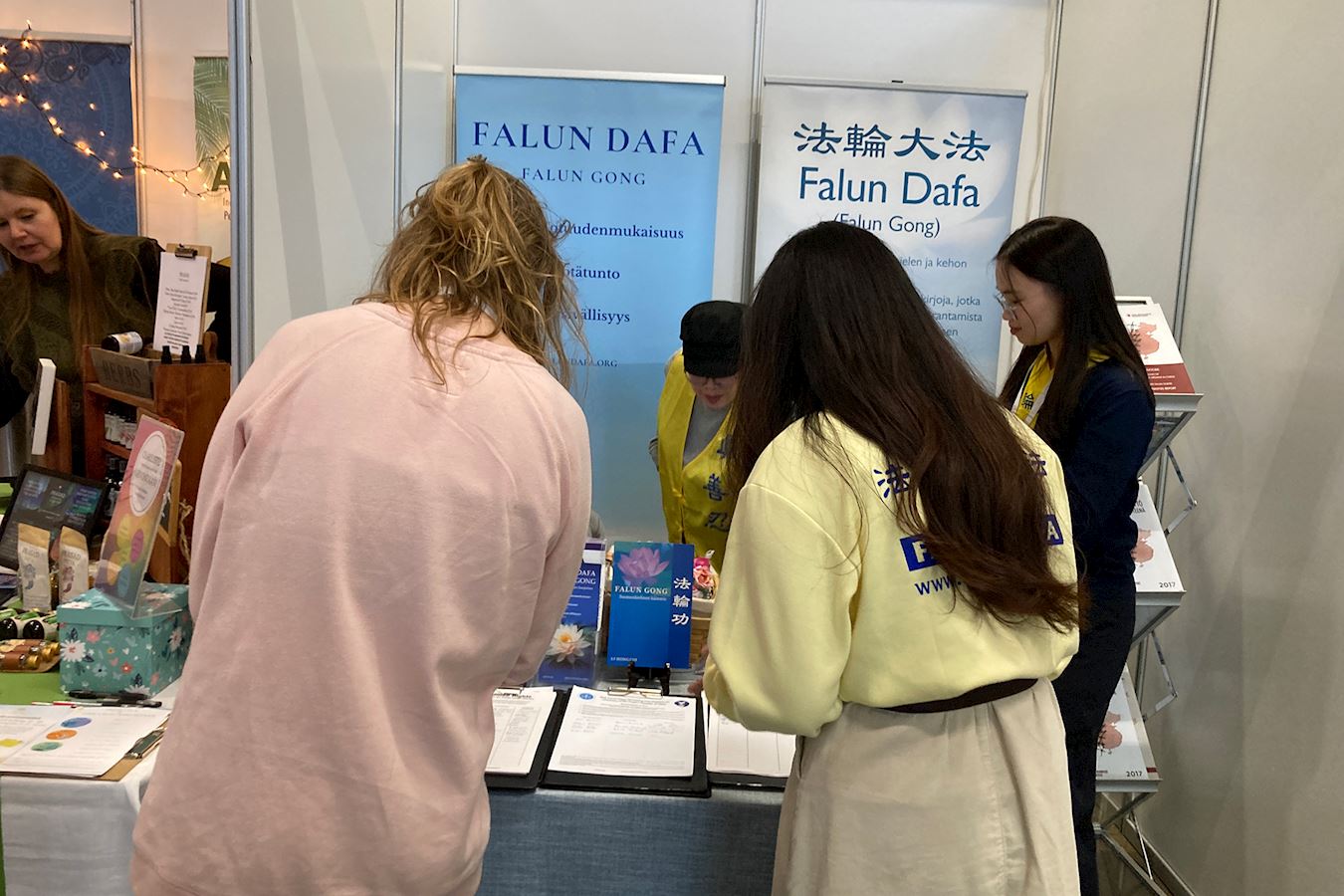 客户经理奥利-佩卡(Olli-pekka)在展位前用英文向俄罗斯朋友塔季扬娜(tatiana)谈论着法轮功。奥利对学员说,“我在蝶略(Töölö)的公园经常看见你们,中共打压法轮功,你们明明是气功,是一种有利身心健康的功法,他们却说成是宗教。”