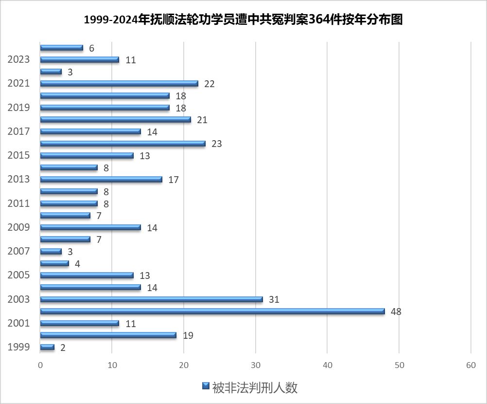 通过明慧网数据获悉,1999年至2024年,在二十五年间,抚顺法轮功学员被中共当局绑架2523人,被冤判的案例364件,其中34位法轮功学员被迫害致死。在经济方面,已知近九年来,法轮功学员被法院勒索共计罚金676,000元,涉及140案例。