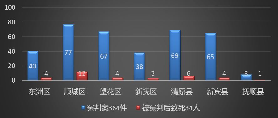 ![]() 图3:1999-2024年辽宁抚顺冤判案364件,被迫害致死34人,在抚顺四区三县分布 |