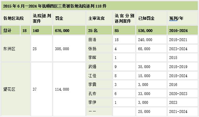 抚顺东洲法院勒索罚款金额为最多,高达308,000元,田浩一人勒索罚款额就达240,000元,涉案18件构陷案。在二零二一年,田浩诬判刘书梅7年徒刑,勒索罚款28,000元。(罚款额是按每年4千元计算,不知是哪条法文规定的?)东洲法官张扬(女)2023-2024两年就判了四个冤案,勒索罚金54,000元。