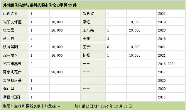 需要说明的是,这里所列数据都是不完全统计,因还有相当一部份法轮功学员的迫害情况没有被传递、报道出来。本文主要是对1999年至2024年抚顺市法轮功学员被非法判刑案例,以及之后遭迫害致死案例的纪实摘要,涉及被冤判而致死的34人。