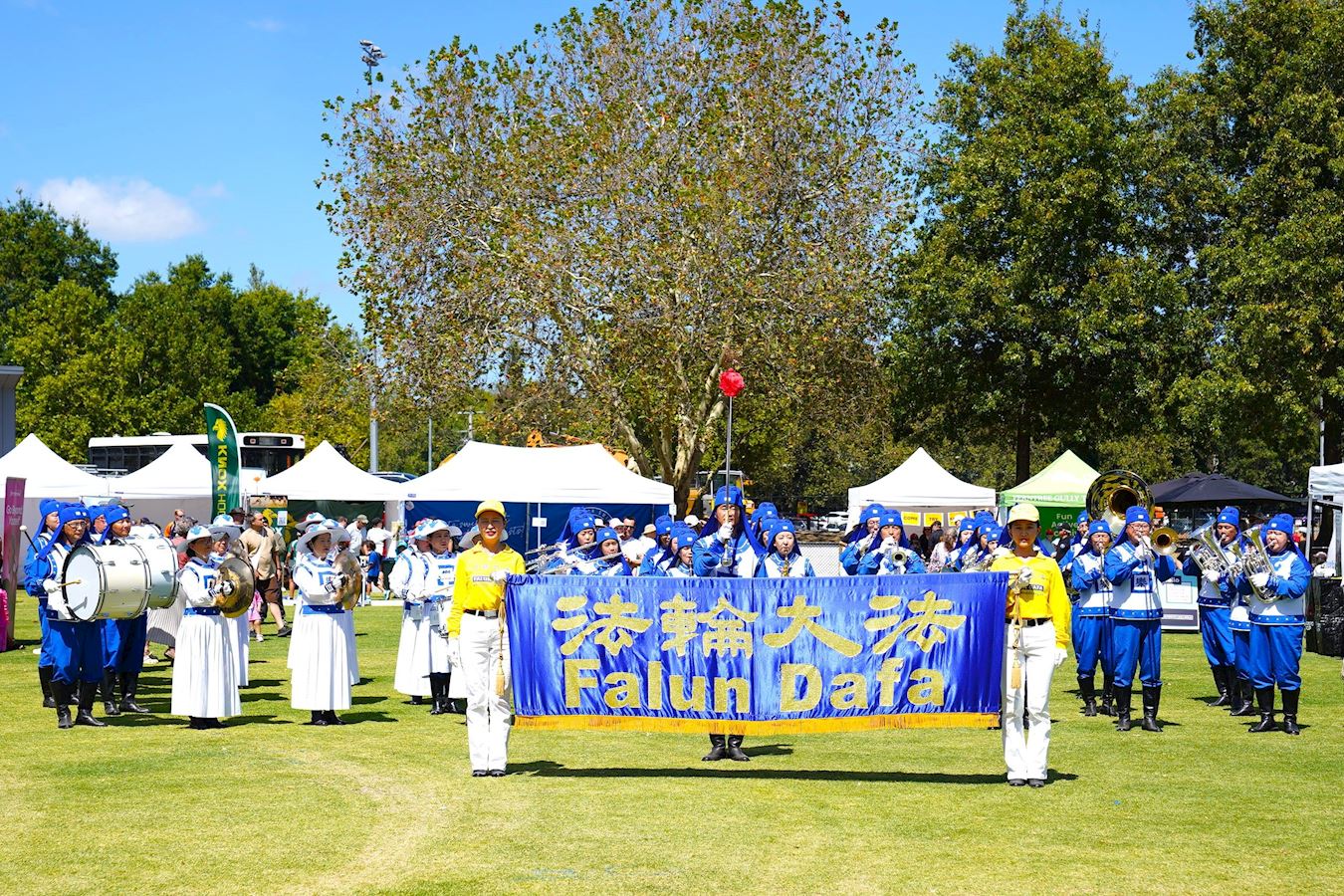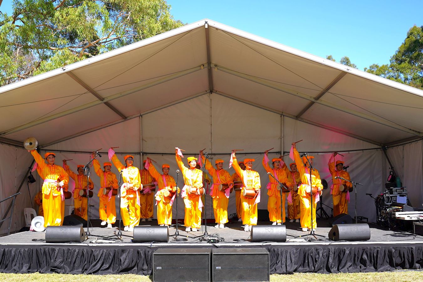 在两个演出舞台上,受邀表演的团体各展风采。其中,法轮大法天国乐团、腰鼓队和舞龙队的表演,以及优美祥和的法轮功功法演示,赢得观众们的阵阵掌声与喝彩。