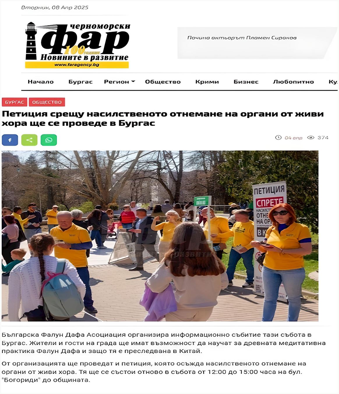 ![]() 图4:二零二五年四月四日,黑海灯塔的报道了保加利亚法轮大法协会发起的签署谴责中共活摘器官请愿书的倡议。 |