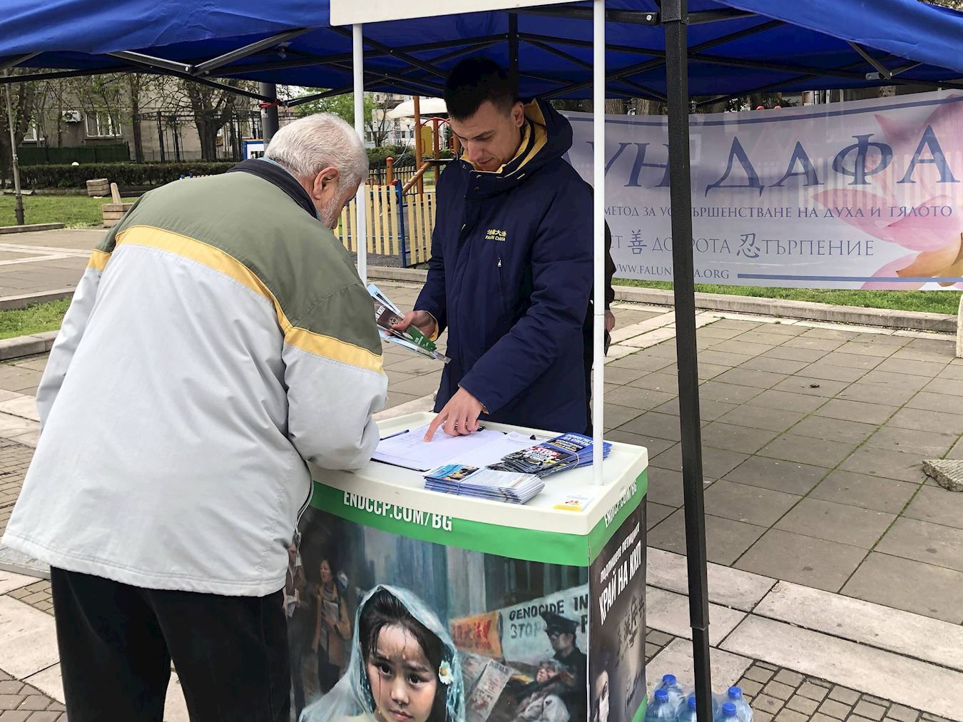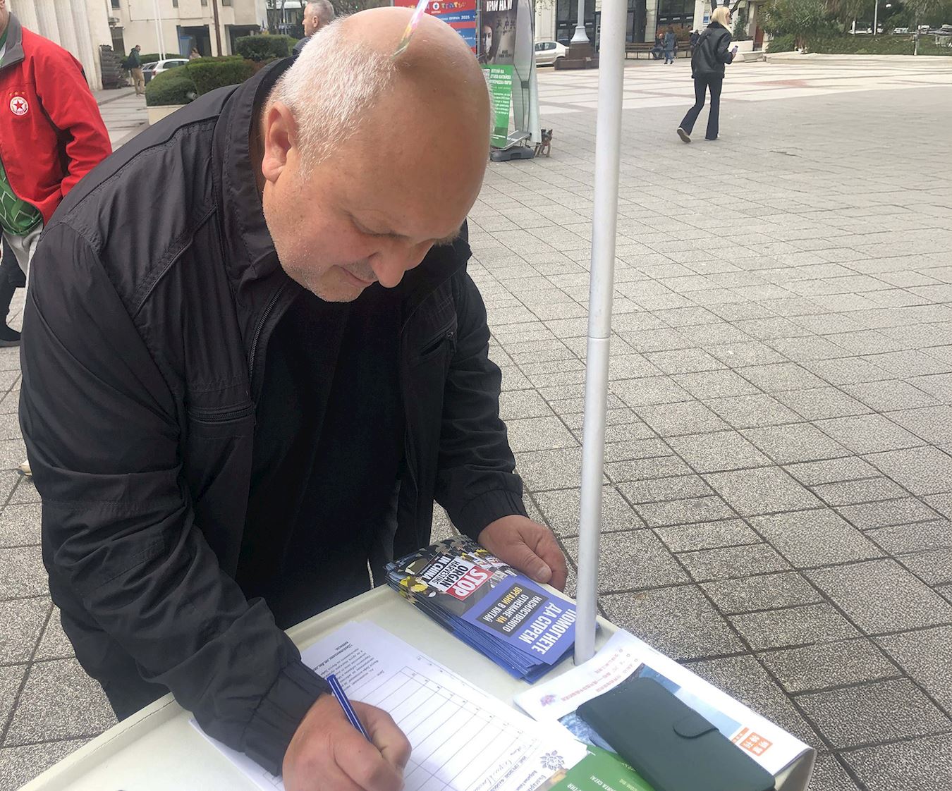 两名年轻人来到展位上,其中一位名叫菲利普(Philip)的年轻人表示,他之前在旧扎戈拉(Stara Zagora)已经签署过请愿书,这次在布尔加斯再次遇见法轮功,特意把朋友斯兰乔(Slancho)也带过来签名。