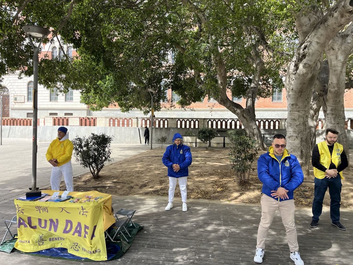 活动当天尽管风很大,周围没有多少人,但学员们坚持展示法轮功功法,给行人讲真相。