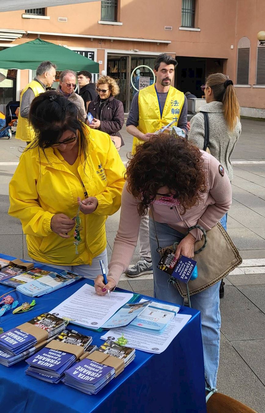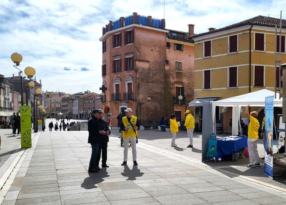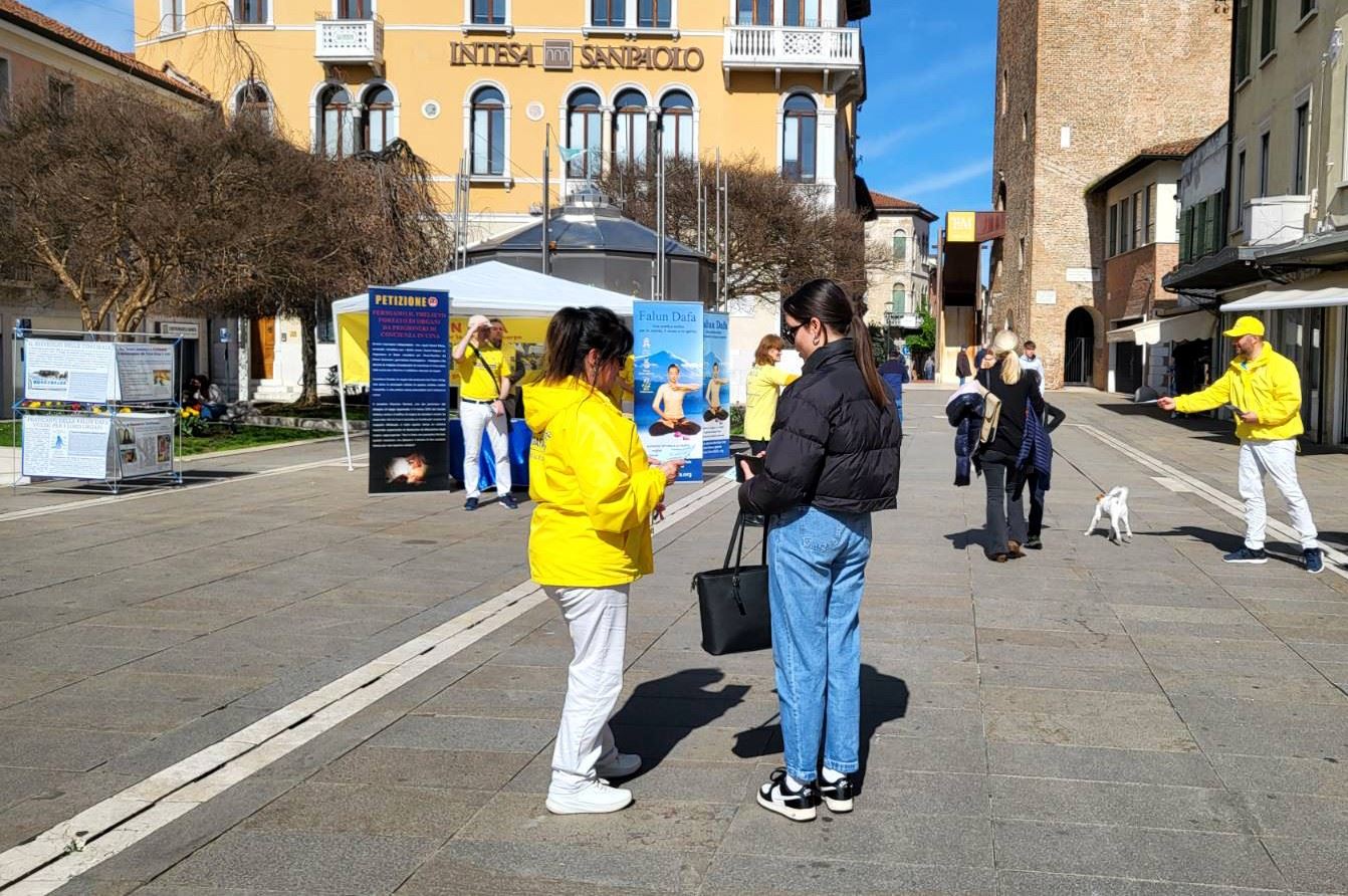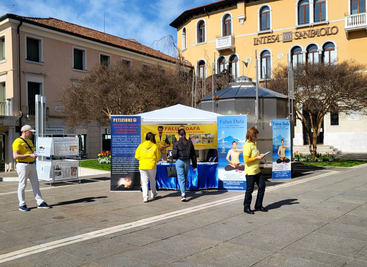 三月二十九日星期六,法轮功学员在威尼托大区梅斯特雷城(Mestre)市中心,马泰拉广场(Piazza Mattera)举办弘法讲真相活动。梅斯特雷(Mestre)是意大利举世闻名的水城威尼斯的卫星城市。