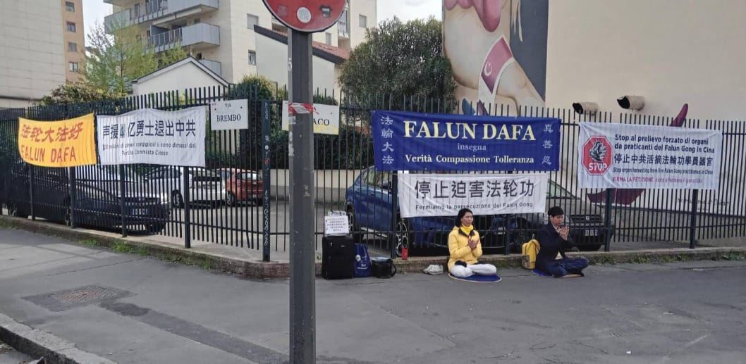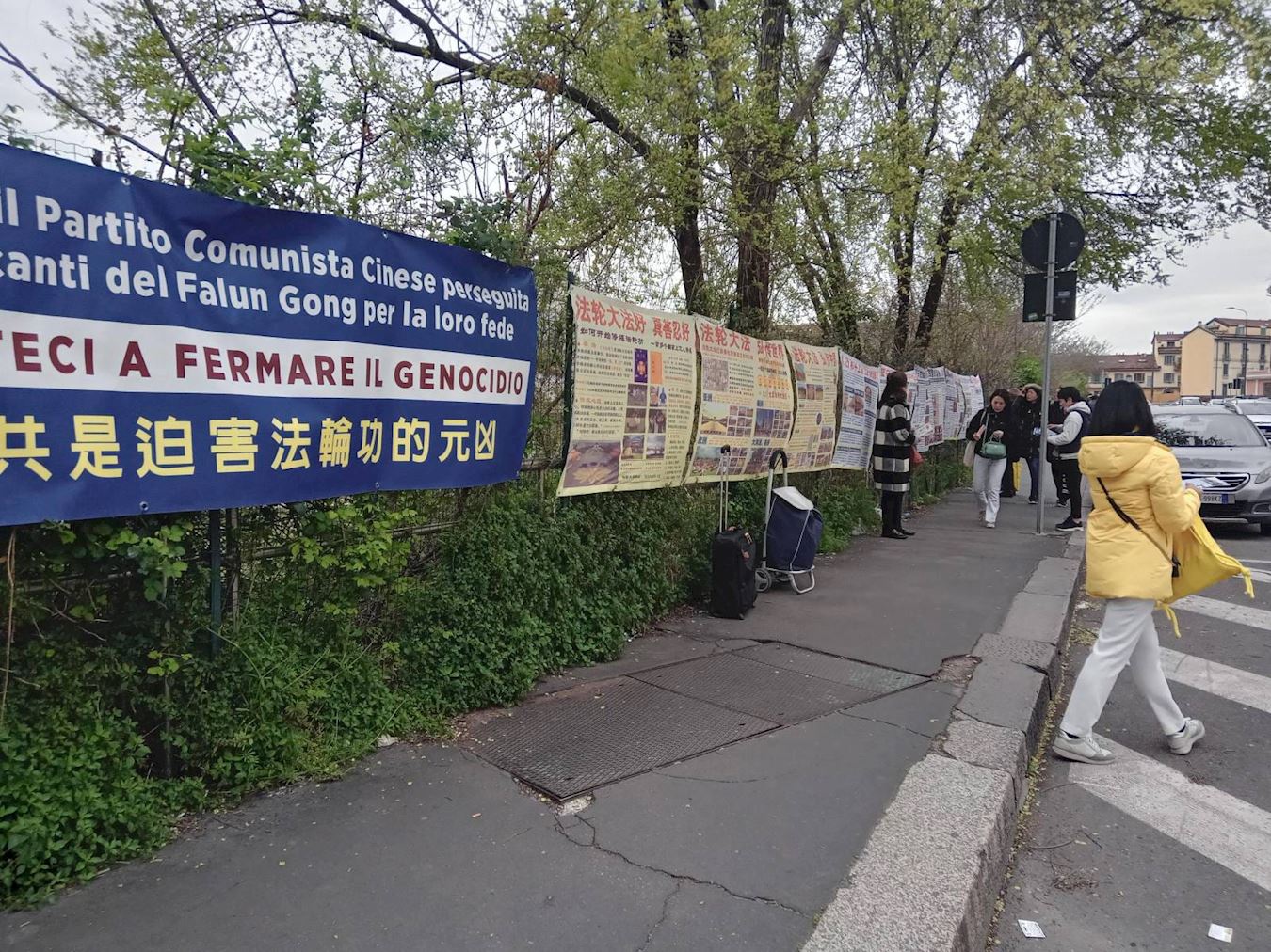 四月二日和九日两天,米兰法轮功学员在米兰中领馆前举行活动,呼吁停止这场在中国持续了二十五年的迫害。他们设立了中文信息板,帮助路过的中国人了解真相。其中有用中文和意大利文写的横幅:“法轮大法教导真善忍”“停止迫害法轮功”“停止活摘法轮功学员器官”