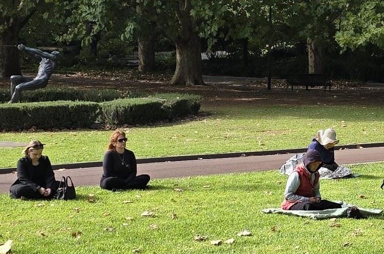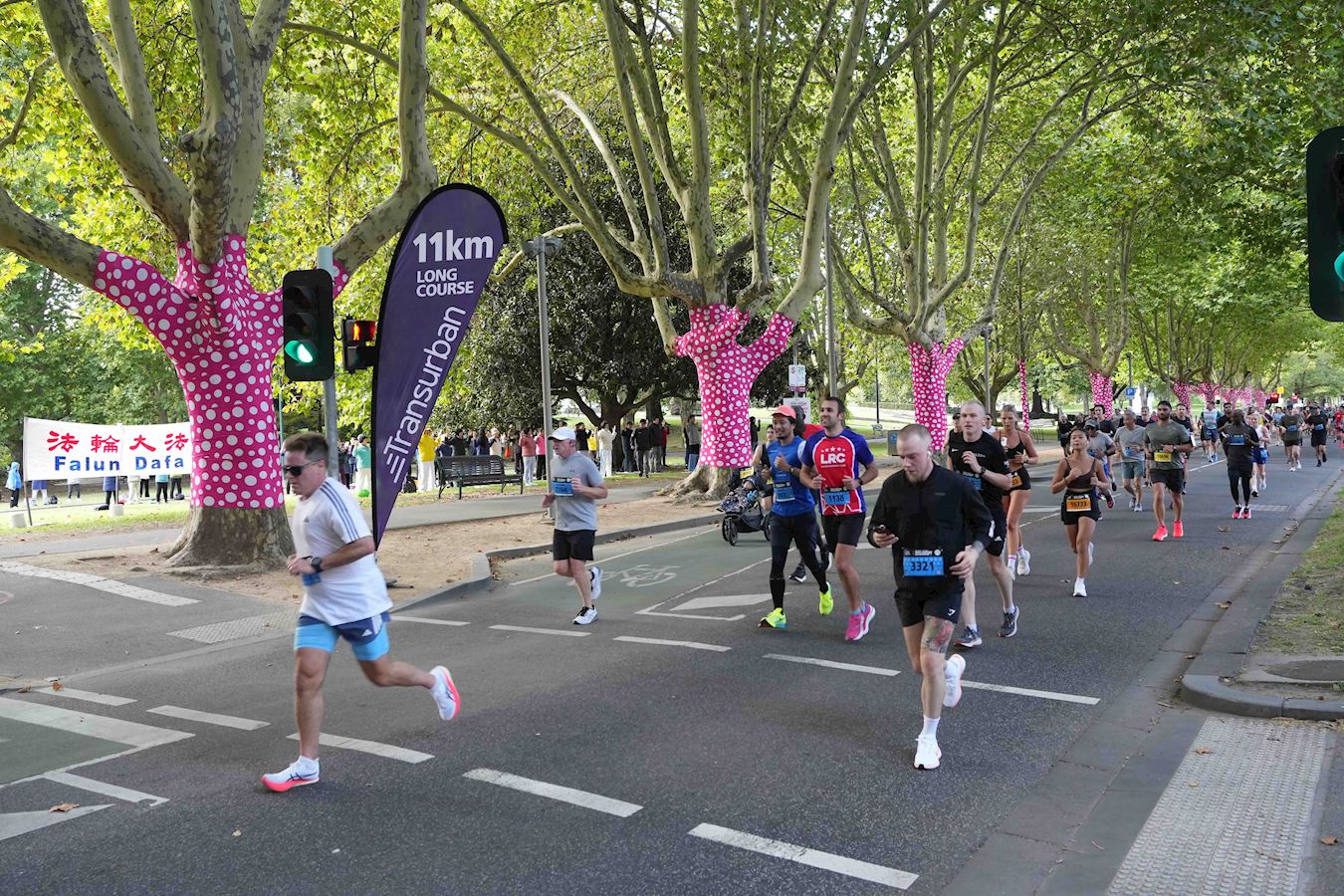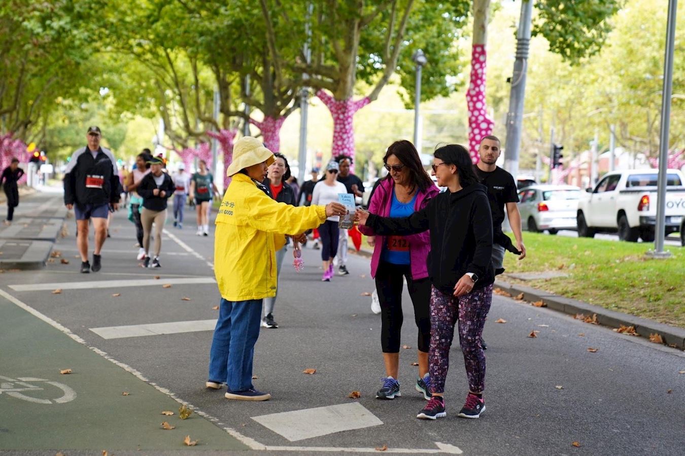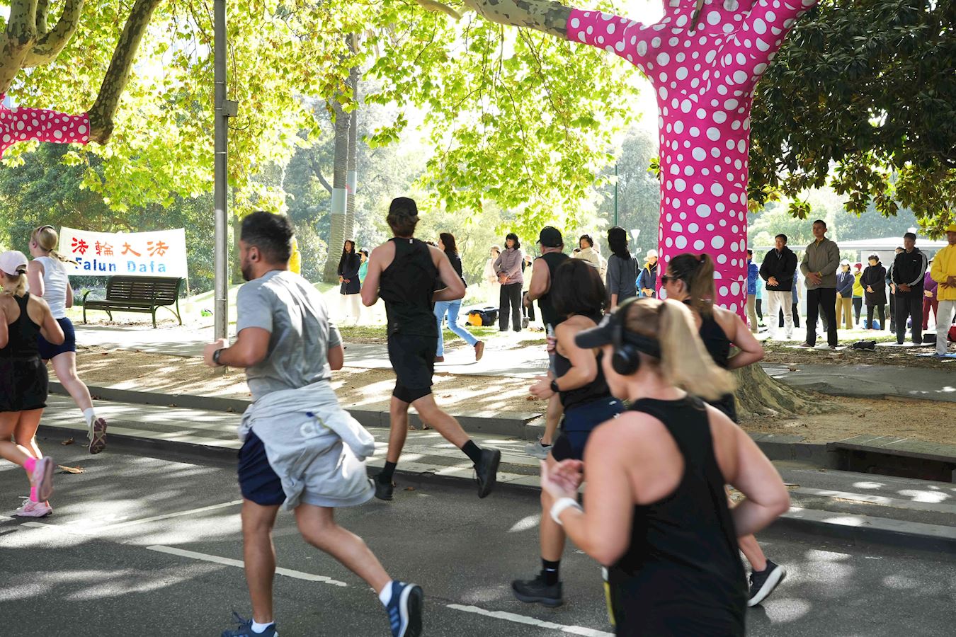二零二五年四月六日,墨尔本市中心举行的“为孩子而跑”(Run for the Kids)慈善长跑活动,每年都吸引了数万名跑步爱好者和慈善支持者。位于市中心的维多利亚女王公园(Queen Victoria Gardens),在长跑选手必经的大路旁。数十位法轮功学员从清晨开始,随着悠扬的音乐集体炼功。