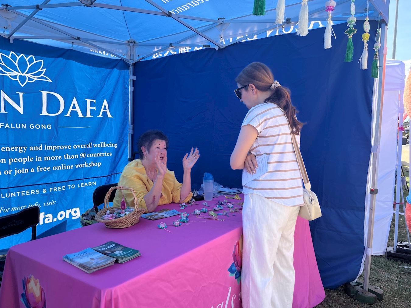 现场各种丰富多彩的活动,吸引了不同年龄段的民众。在欢乐的氛围中,在法轮大法展位上,学员们展示了祥和舒缓的五套功法,各族裔民众纷纷驻足,和法轮功学员交谈,并现场学炼功法。一位电脑工程师学炼之后赞叹:真的很神奇,立刻感受到身体和内心都得到了舒缓。一名育有三个幼小孩子的斯里兰卡裔母亲表示:真、善、忍理念能正确引导下一代。
