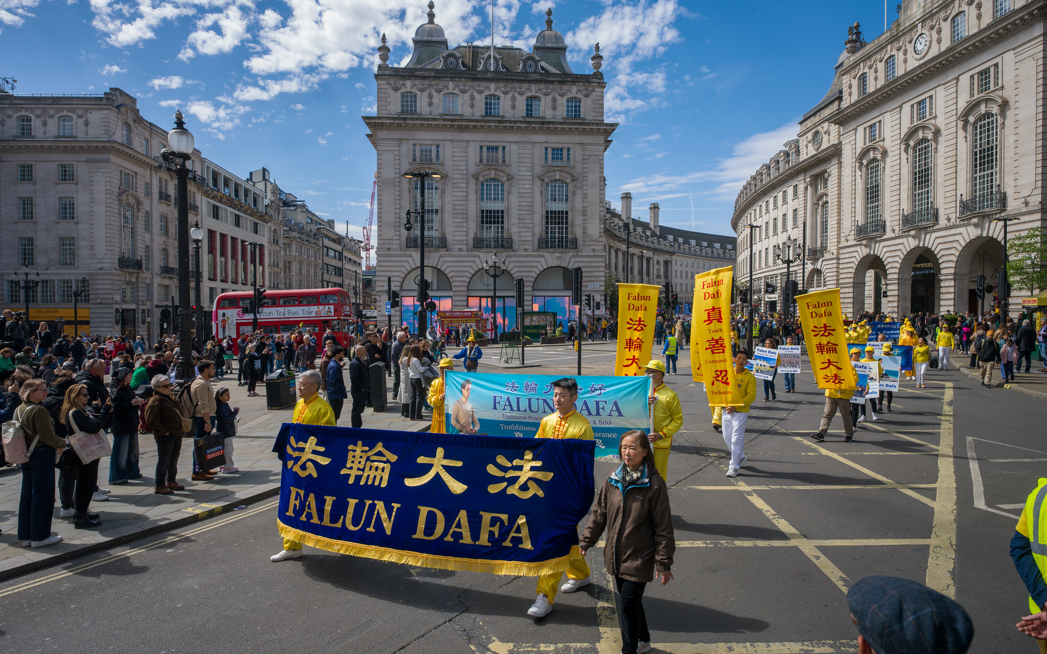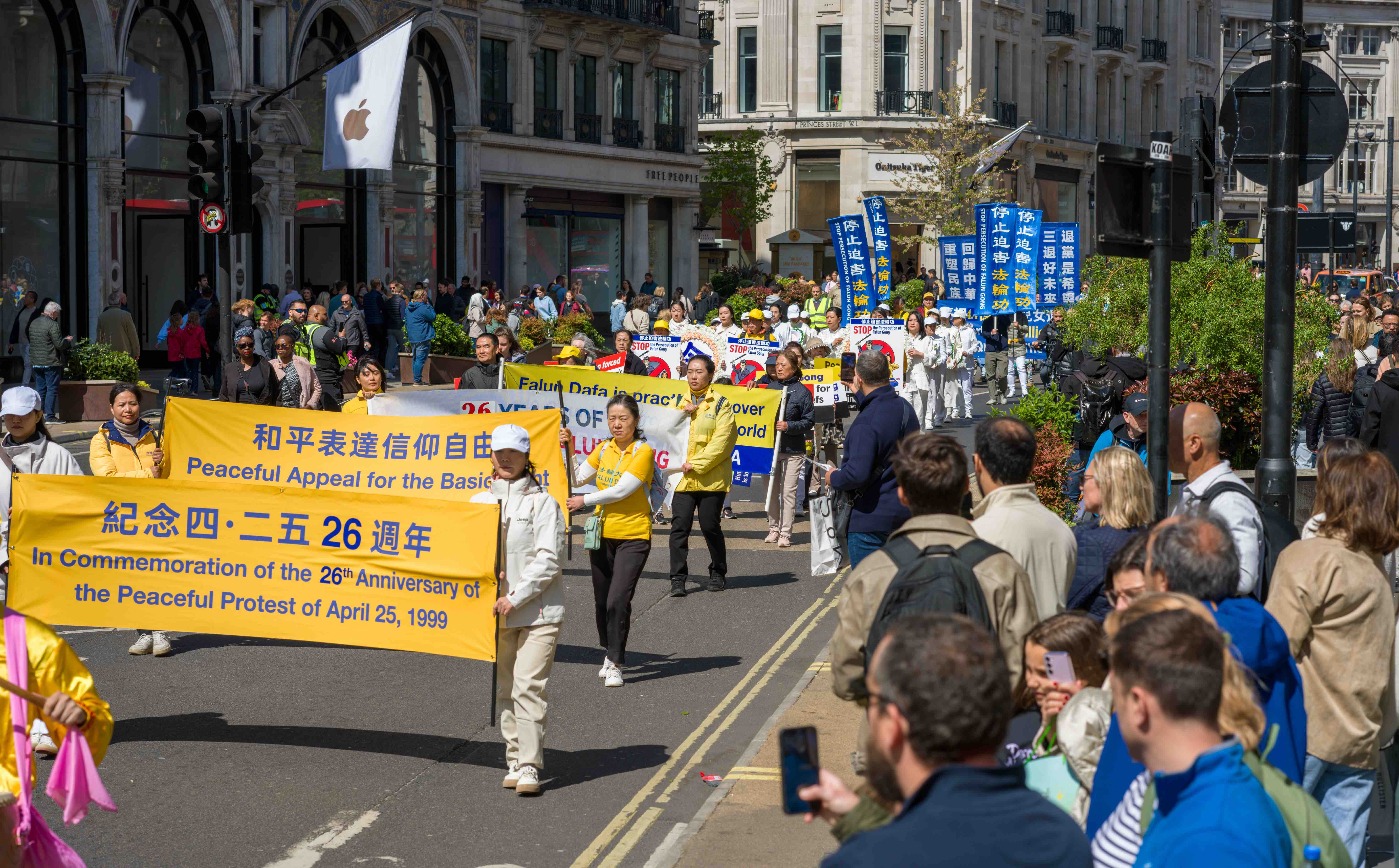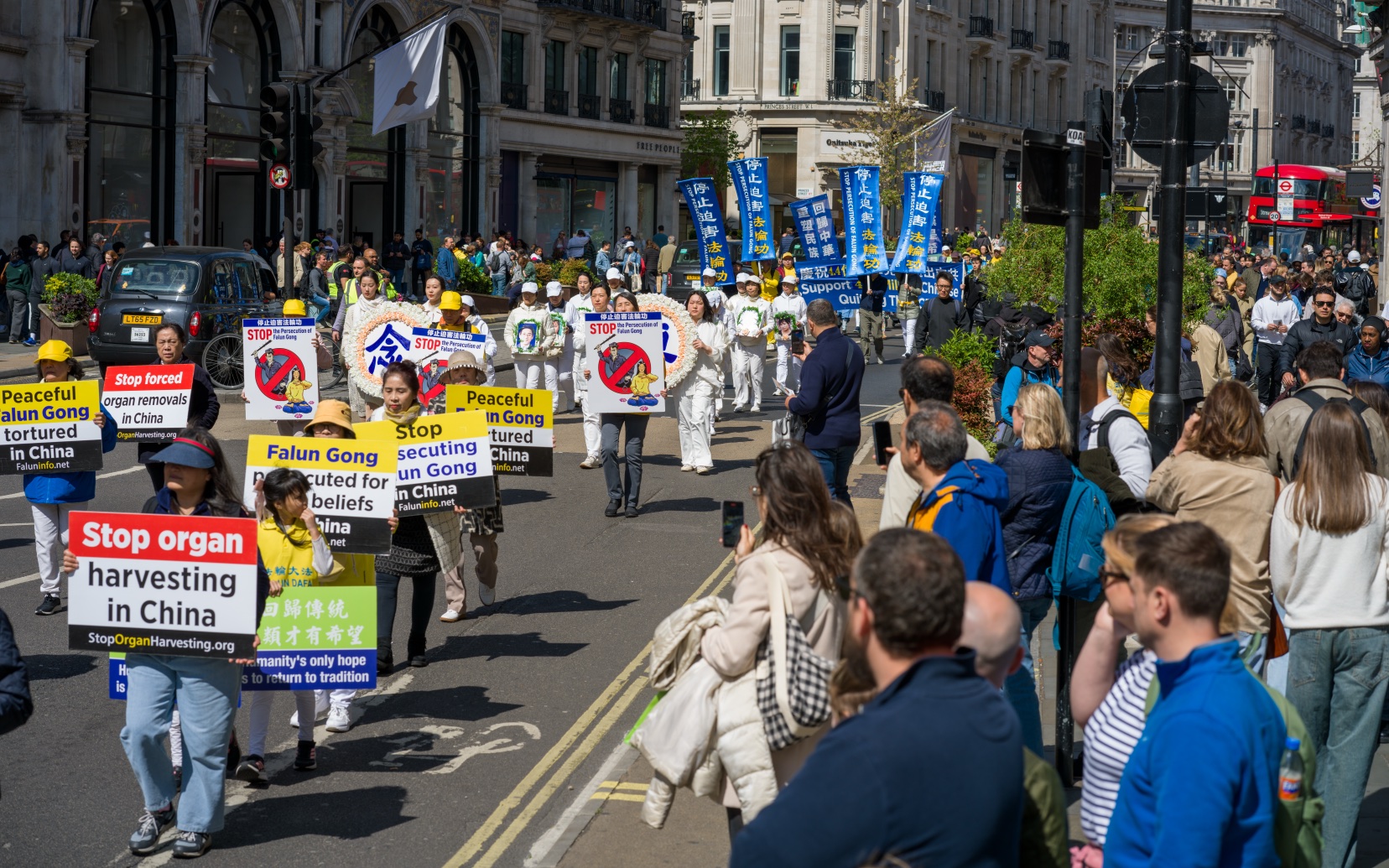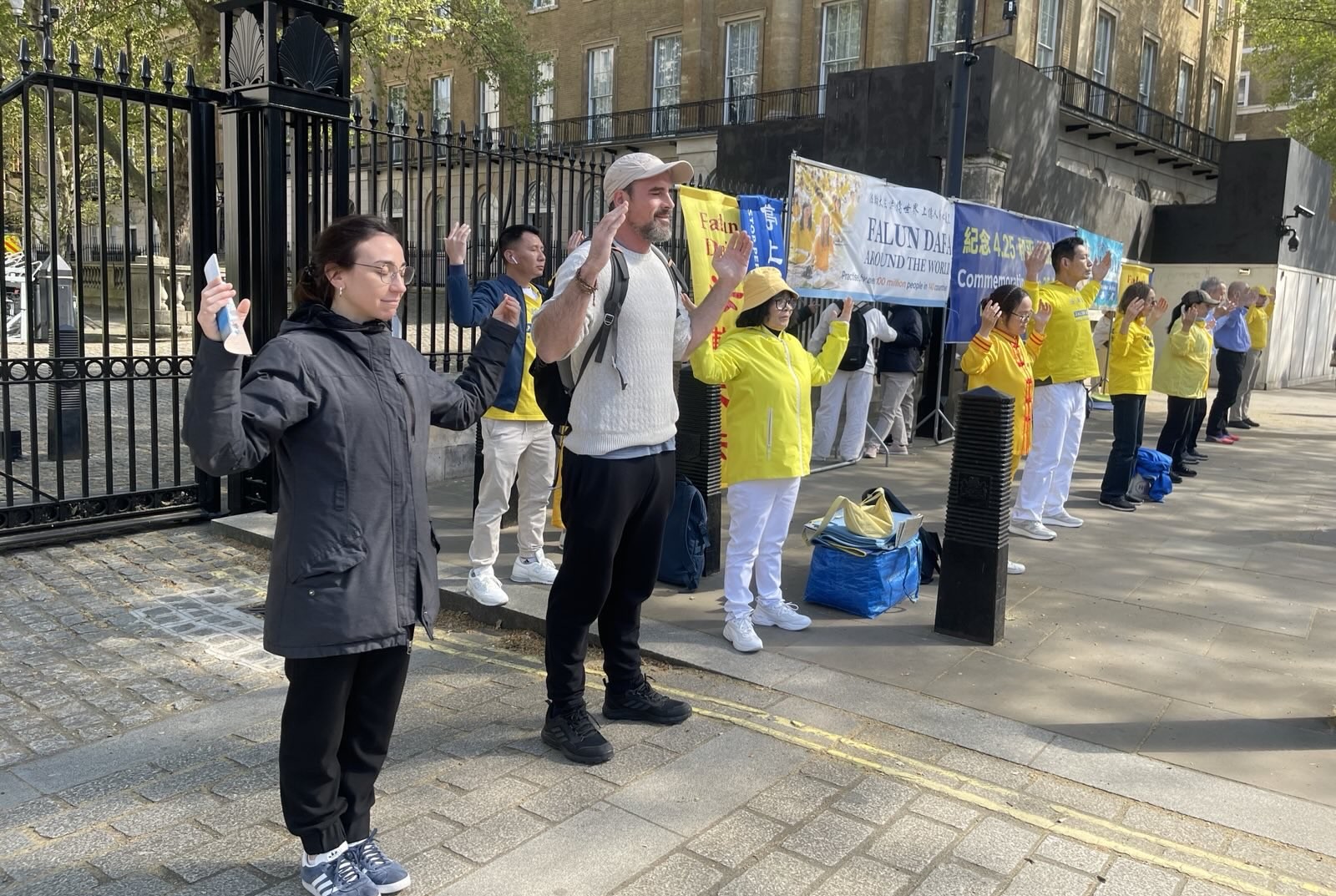 游行队伍穿越伦敦最繁华的商业大道与唐人街,最终抵达唐宁街10号首相府对面,并在此举行新闻发布会,呼吁国际社会关注迫害、捍卫人权与信仰自由。