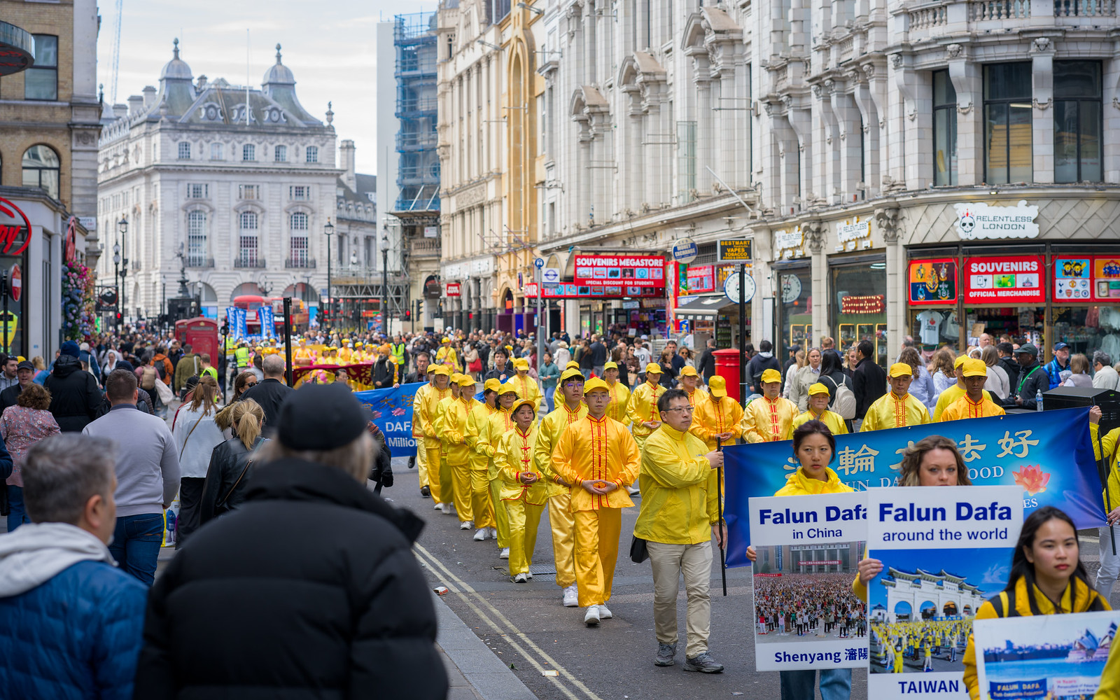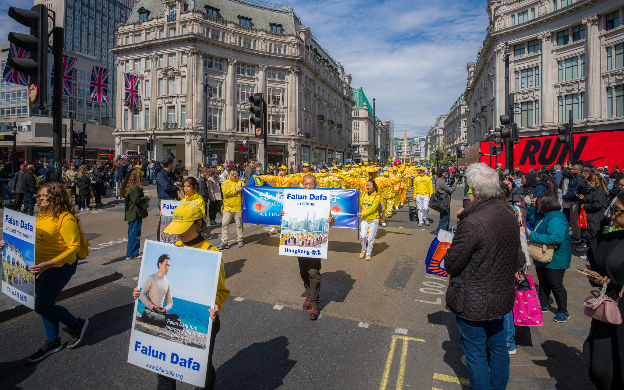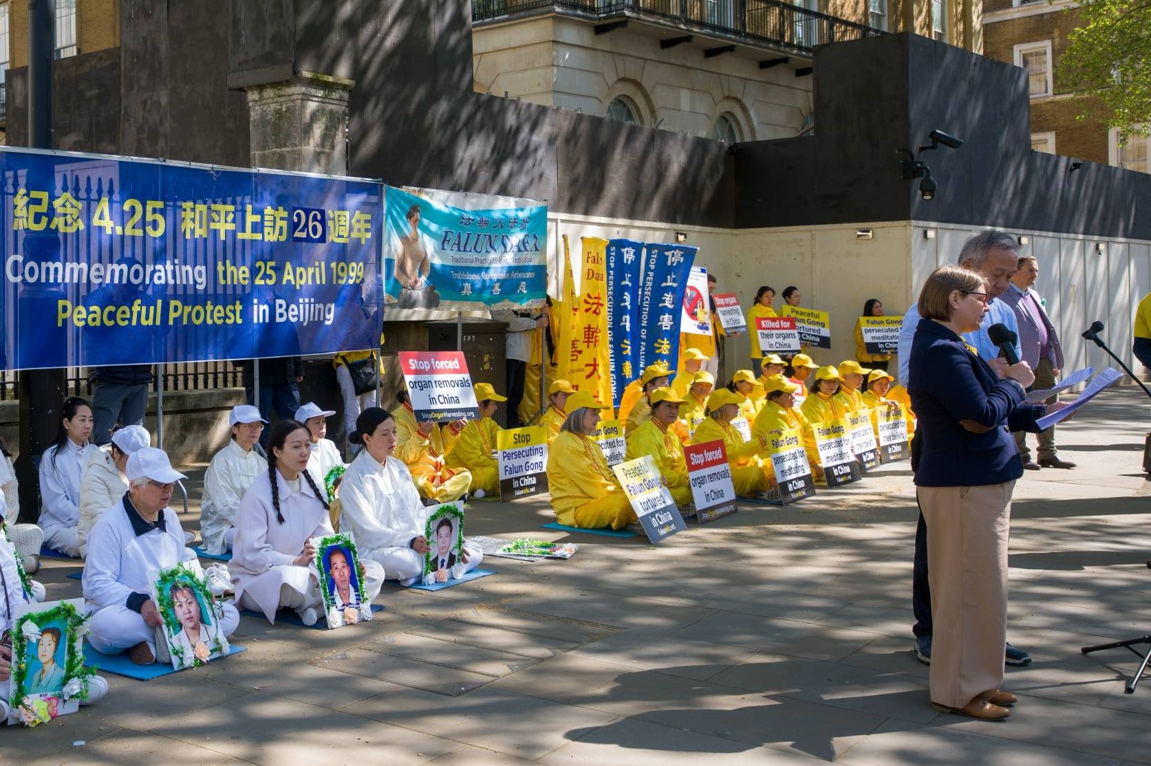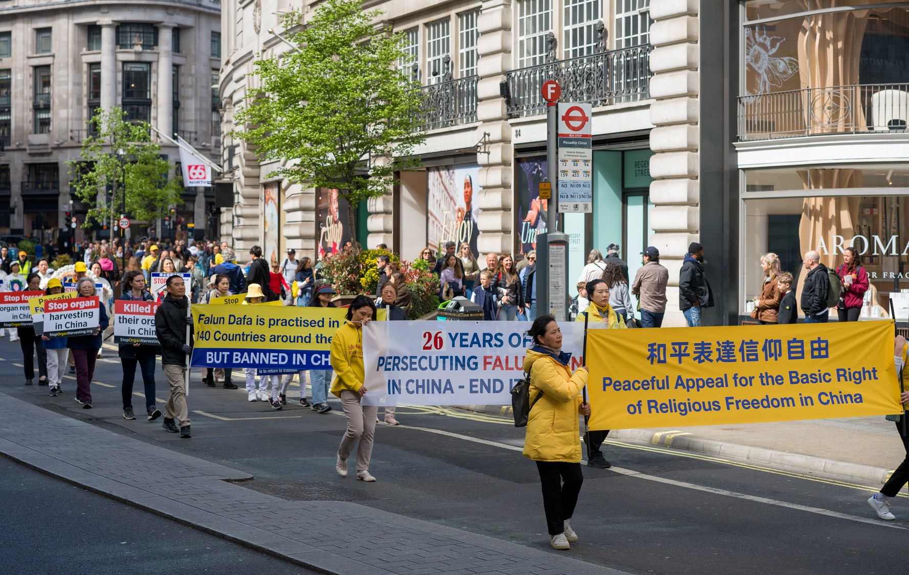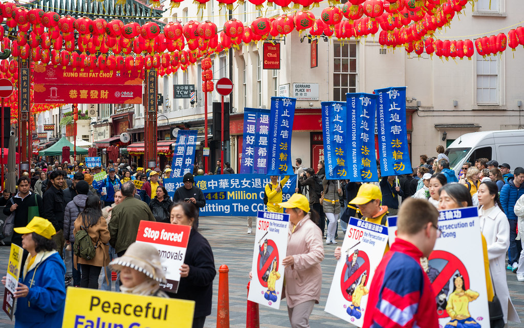 游行队伍穿越伦敦最繁华的商业大道与唐人街,最终抵达唐宁街10号首相府对面,并在此举行新闻发布会,呼吁国际社会关注迫害、捍卫人权与信仰自由。