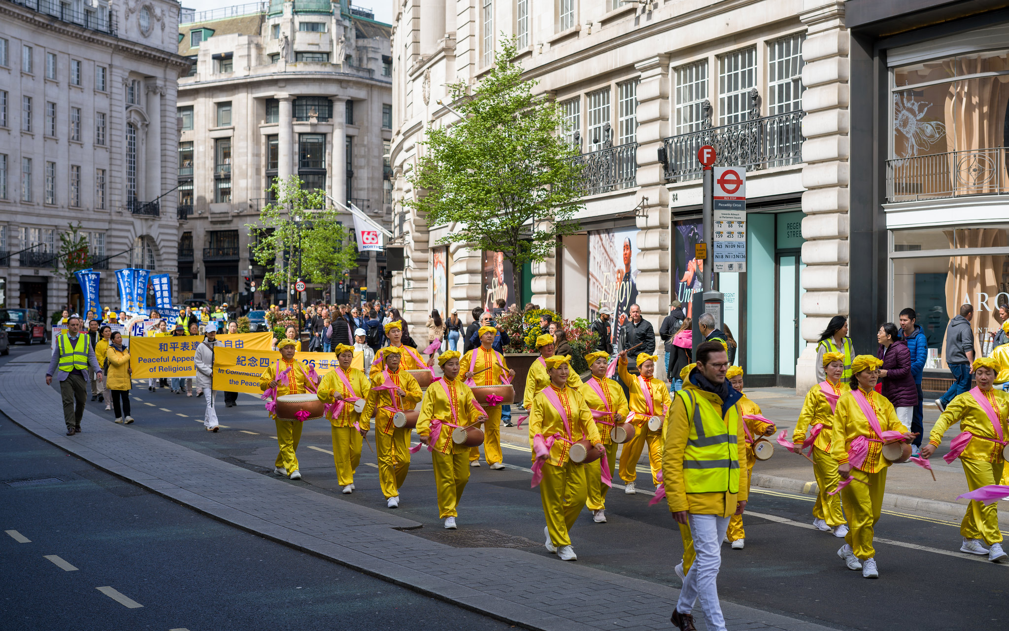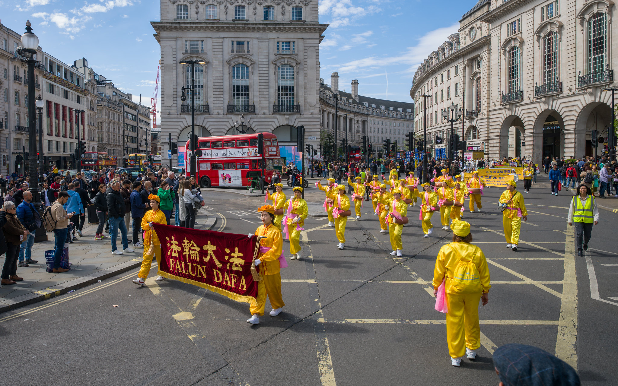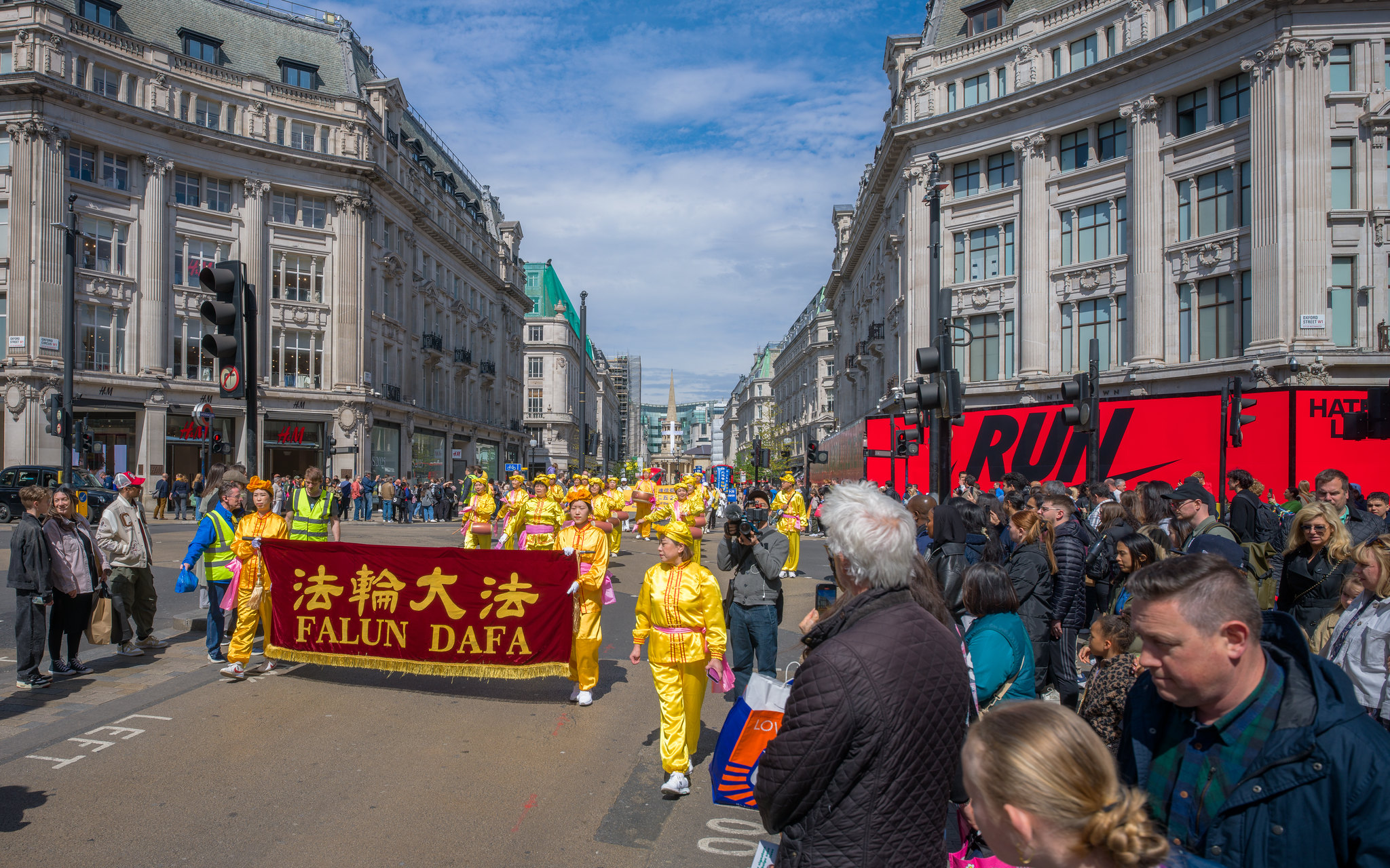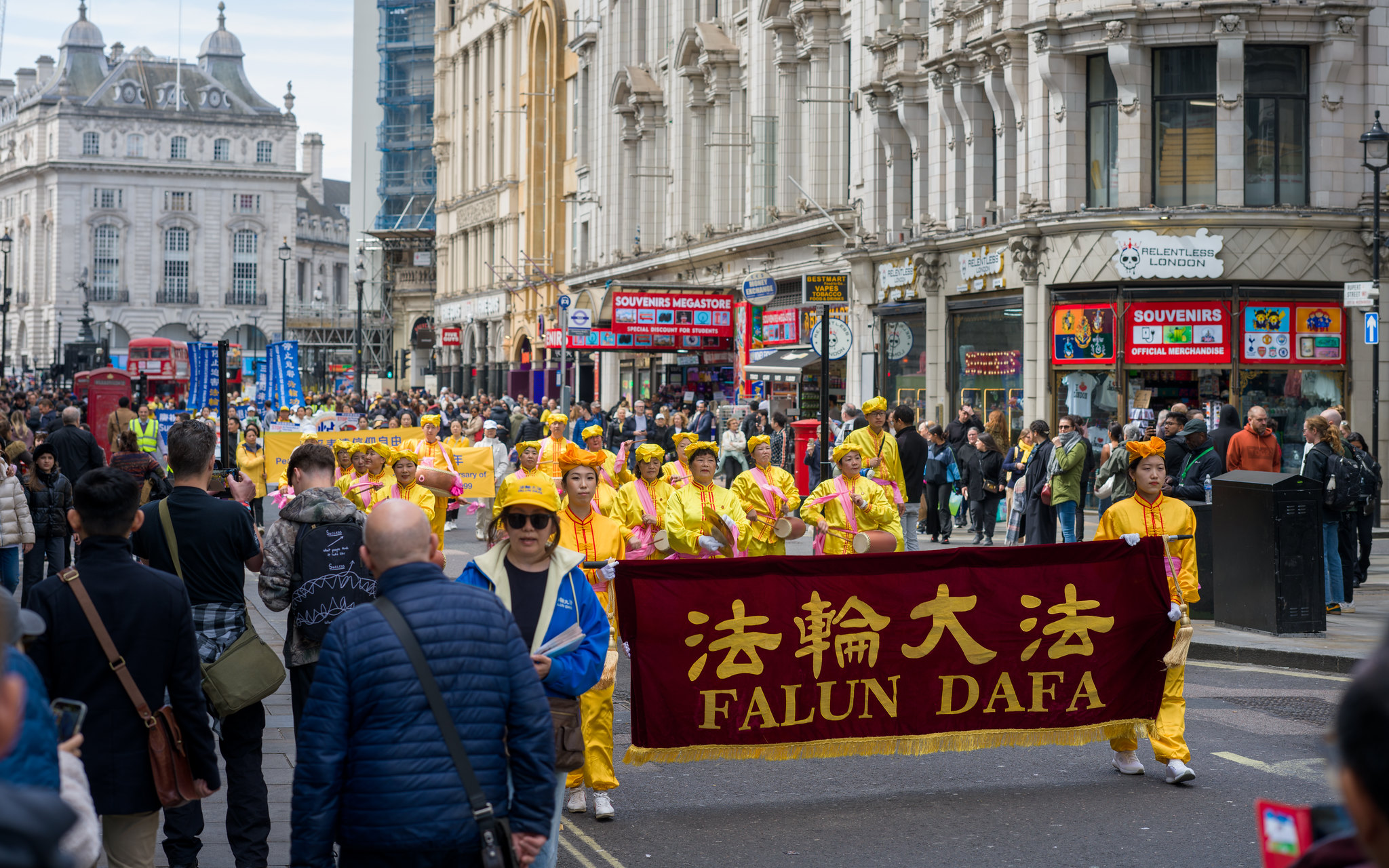 游行队伍穿越伦敦最繁华的商业大道与唐人街,最终抵达唐宁街10号首相府对面,并在此举行新闻发布会,呼吁国际社会关注迫害、捍卫人权与信仰自由。