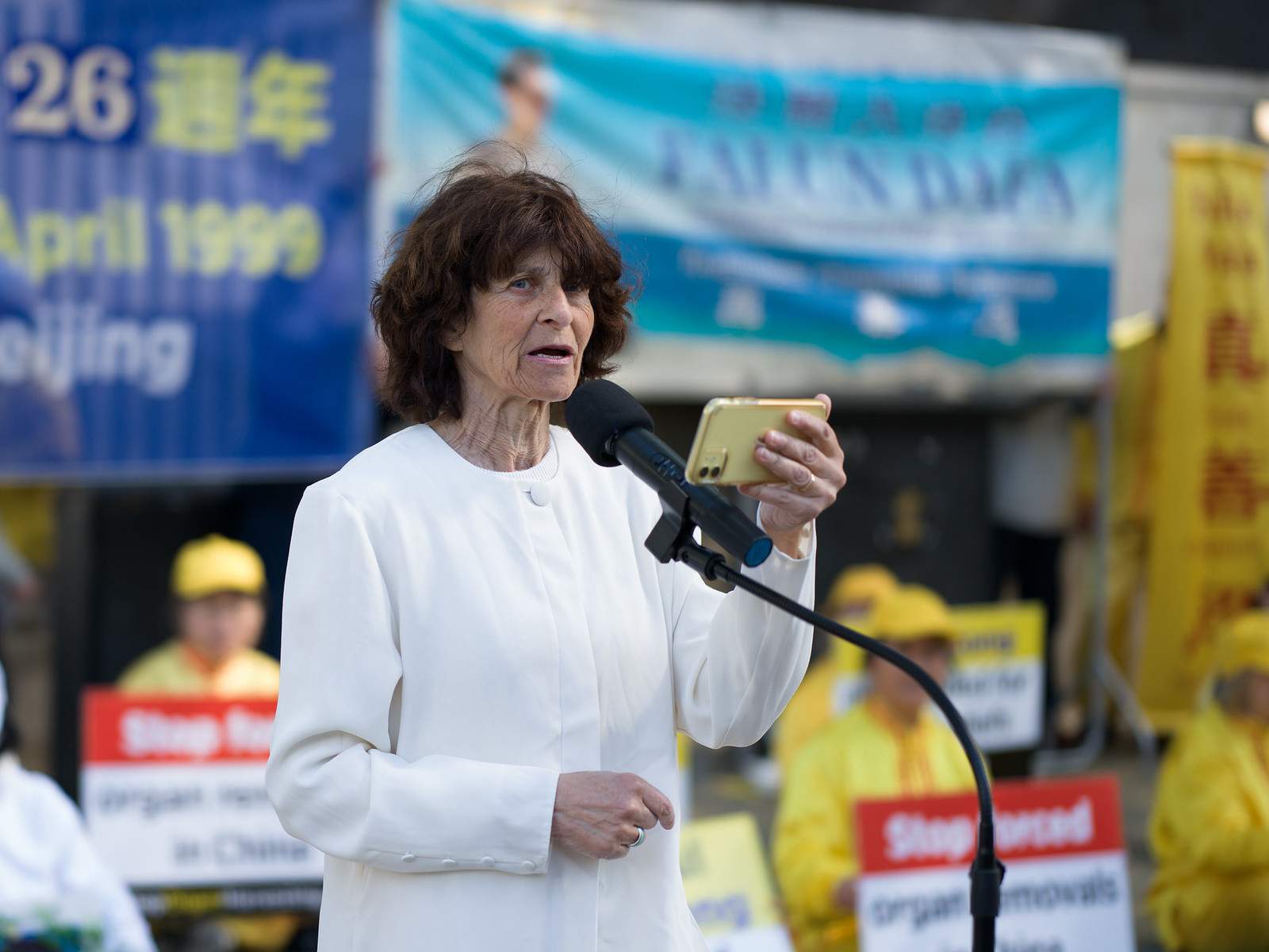 在集会上,来自中国大陆的法轮功学员韩女士讲述了亲历一九九九年“四·二五”万人和平上访的经历。她回忆当天早晨与母亲一起在中南海外安静等待,一天之中没有口号、没有冲突,学员们自觉保持秩序,展现了修炼人的风范。