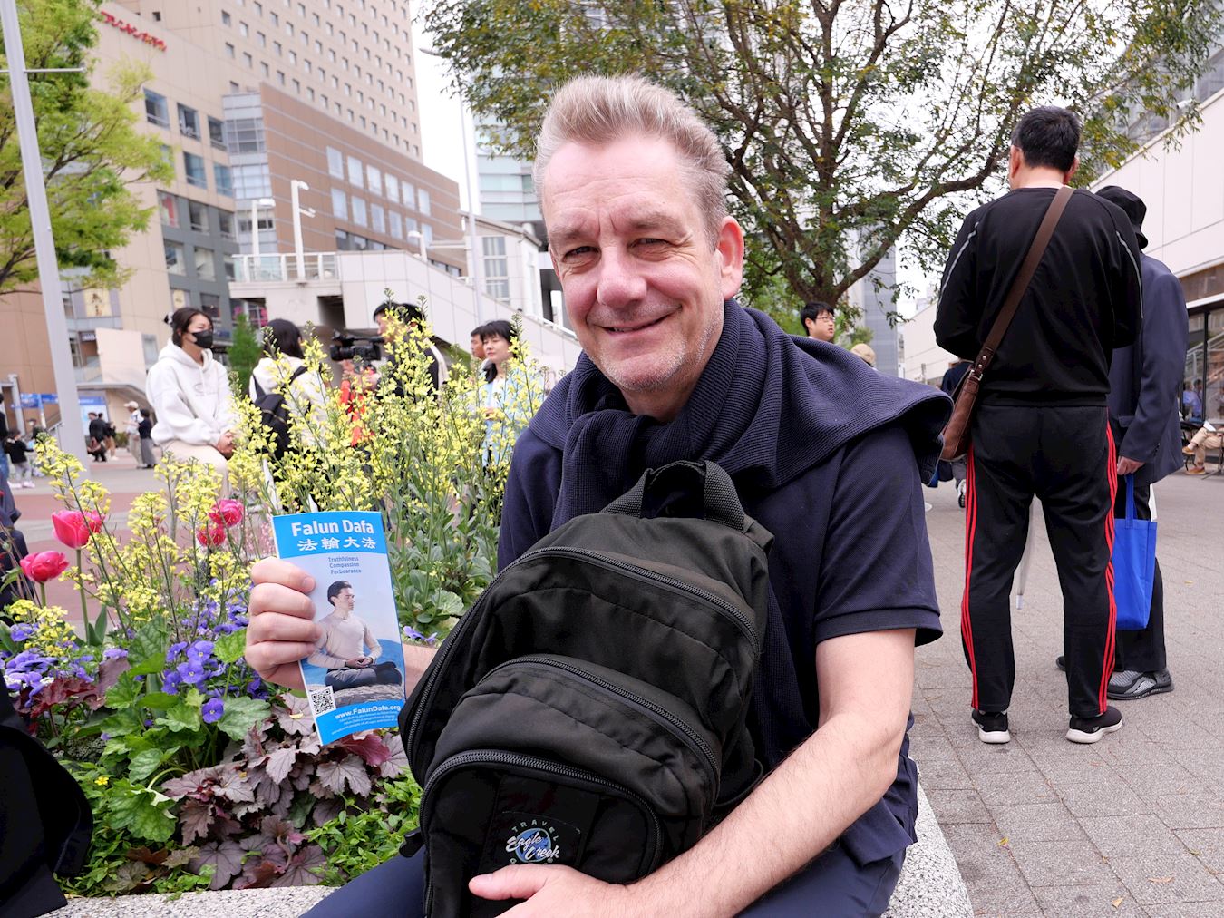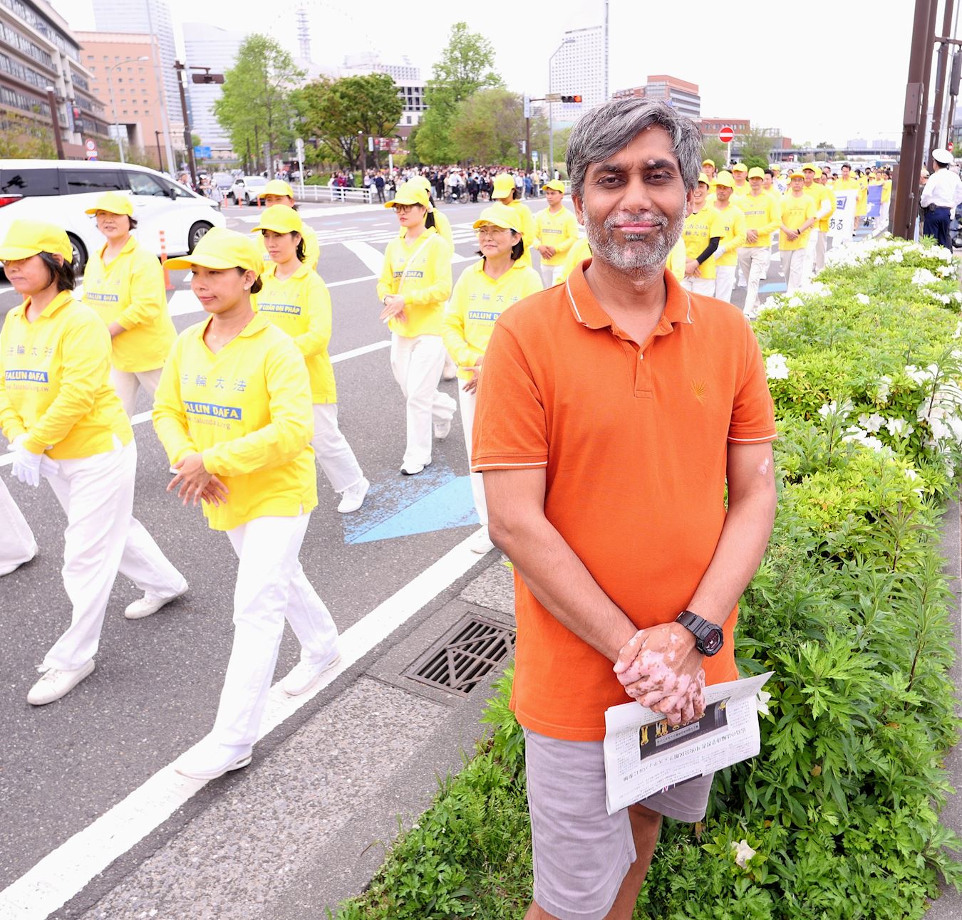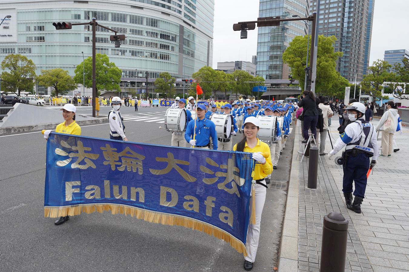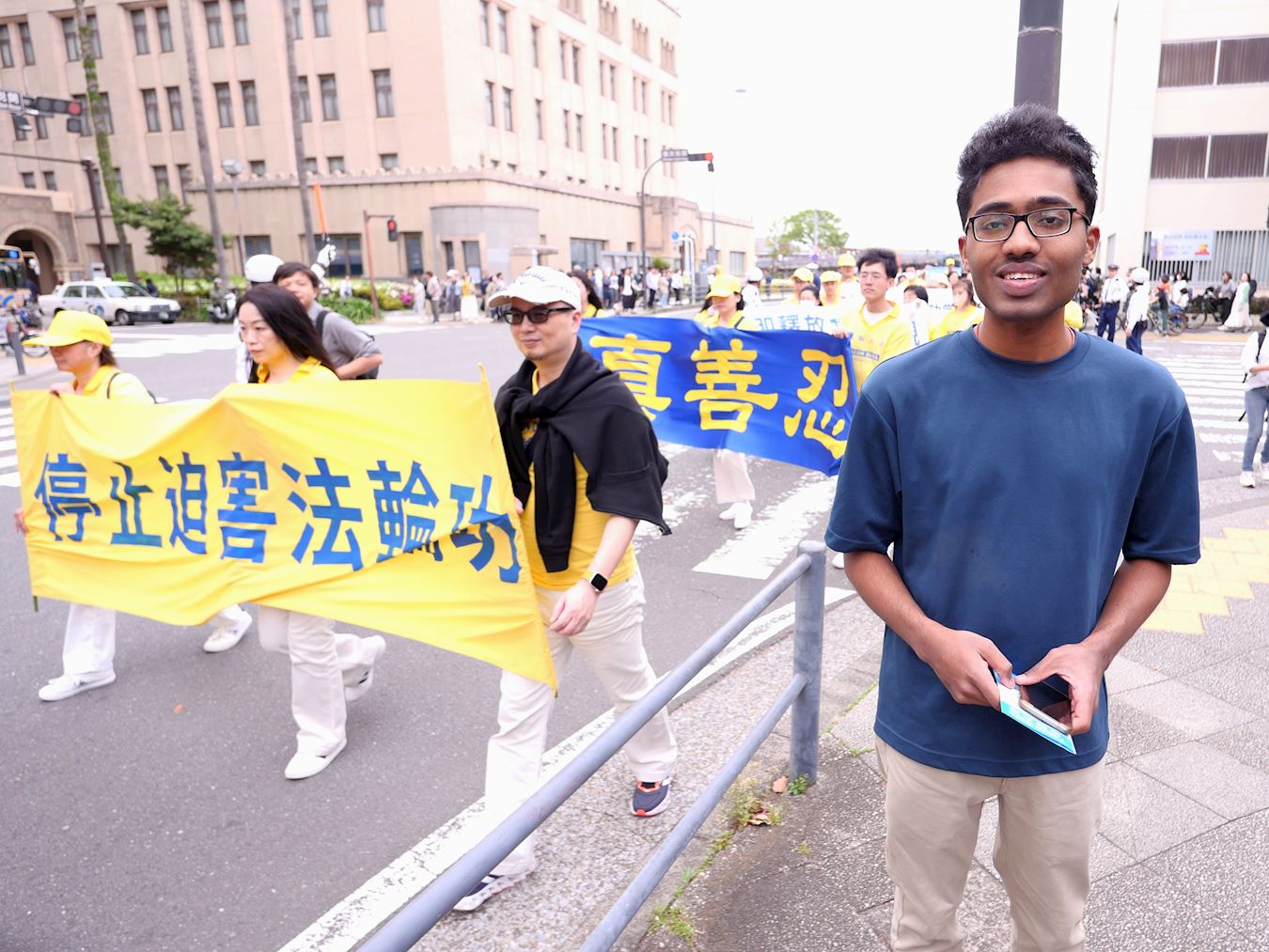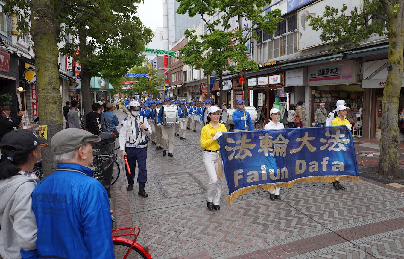 沿路的众多游客被游行队伍吸引,有的随着天国乐团的演奏,人们纷纷鼓掌支持。沿途可以听到日本人喊着“加油”,感觉越来越多的日本人开始将中共与中国人民区分开来。他们对游行队伍挥手致意等,反应非常平和友善。