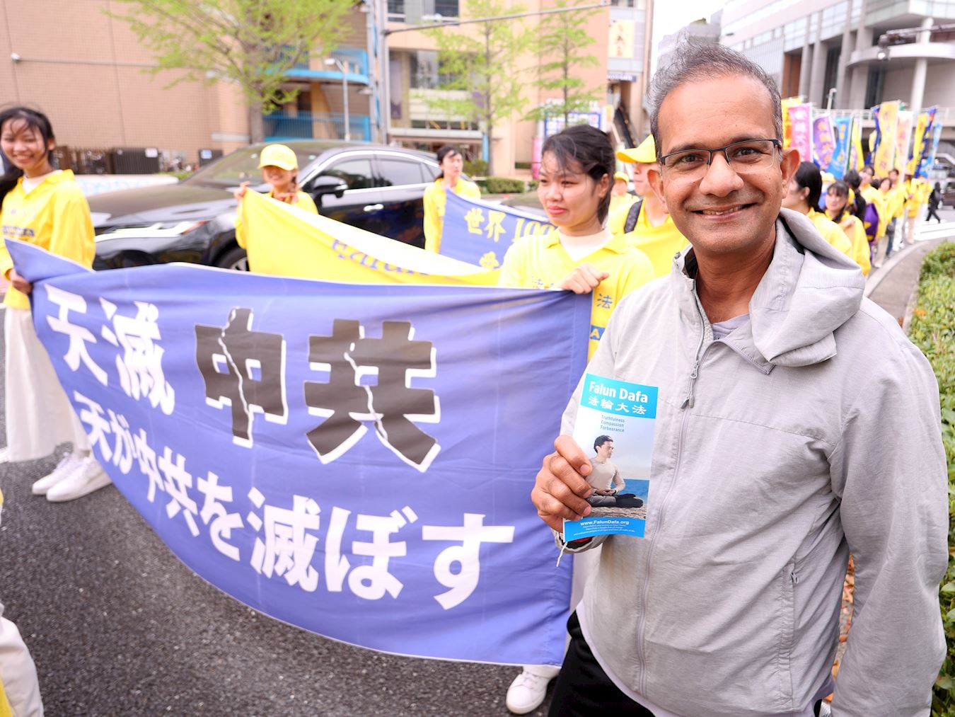 游行出发前,前众议院议员中津川博郷(Hirosato Nakatugawa)先生和江东区议会议员二瓶文隆(Fumitaka Nihei)先生到场声援法轮功的反迫害活动。