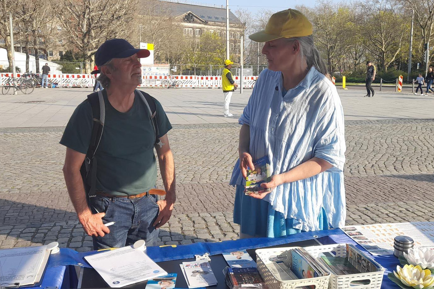 里卡多·斯塔克曾是智利的一名牙医,最近退休了。他陪同女儿前往德累斯顿,因为她想在那里读大学。作为一名退休人员,他正在为生活的新阶段寻找内在的意义,并对法轮大法产生了兴趣。在谈话中,他说:“我对法轮大法很感兴趣。我也会打坐,但目前更多的是印度式的。我是一个注重精神追求的人。”