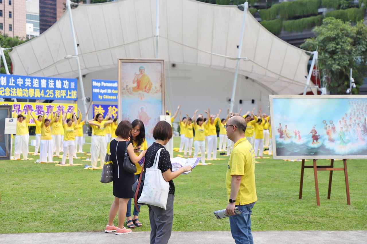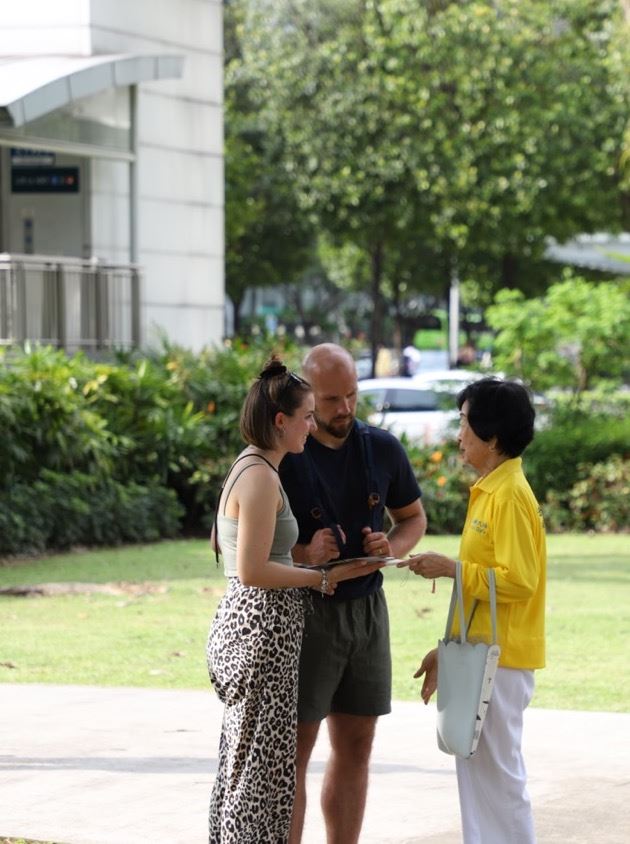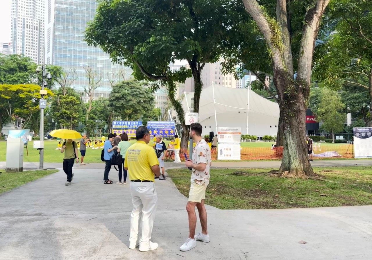 现场以集体炼功、真善忍美展、歌曲演唱等方式向民众传递真相。各族裔民众纷沓而来,驻足观看,了解真相,拍照留念。一位新加坡年轻华人径直走向正在分发资料的法轮功学员说:“你们做得很好,请再接再厉!”