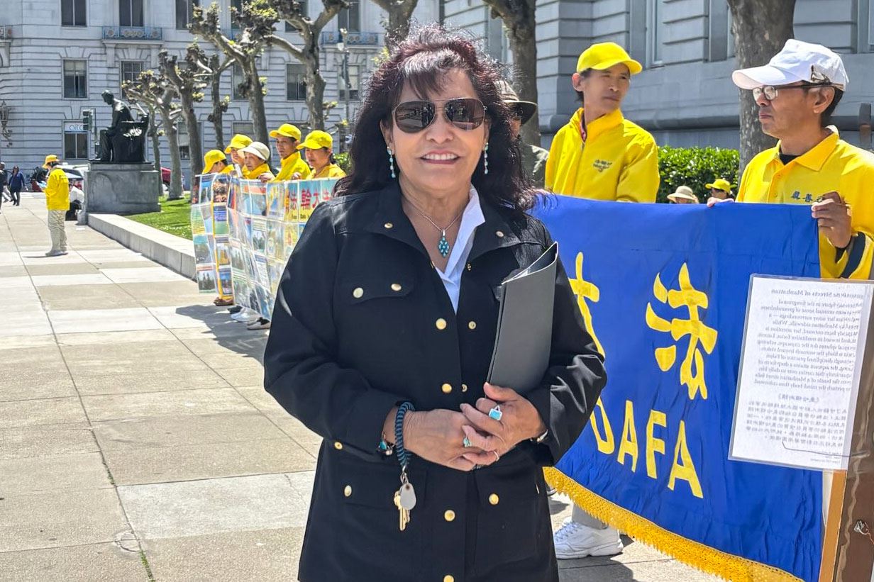 法轮功的原则引起她的共鸣,“我是天主教徒,是在巴拿马长大的,我的祖父是中国人,信仰佛教。法轮功让人感到平和,对人有好处,我也想学炼法轮功。”