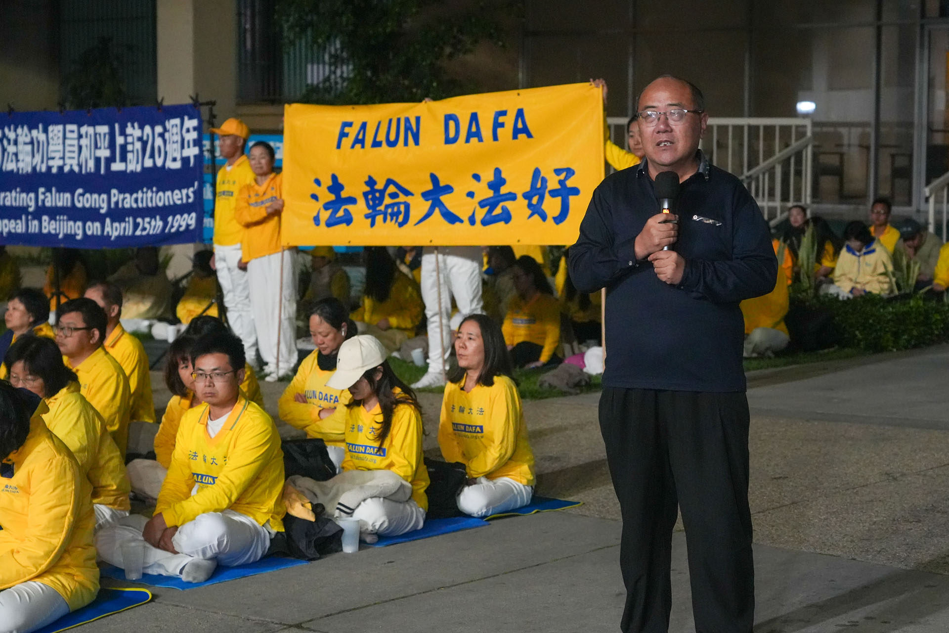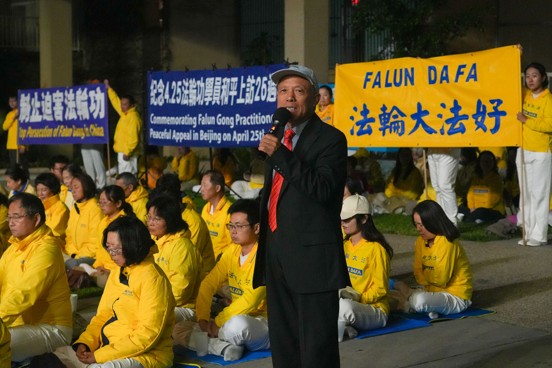 洛杉矶民运领袖——中国社会民主党主席刘因全、中国民主党联合总部主席郑存柱博士,与中国民主党的党员们当晚也来到集会现场,发表演讲声援法轮功学员,并呼吁制止对信仰的迫害。
