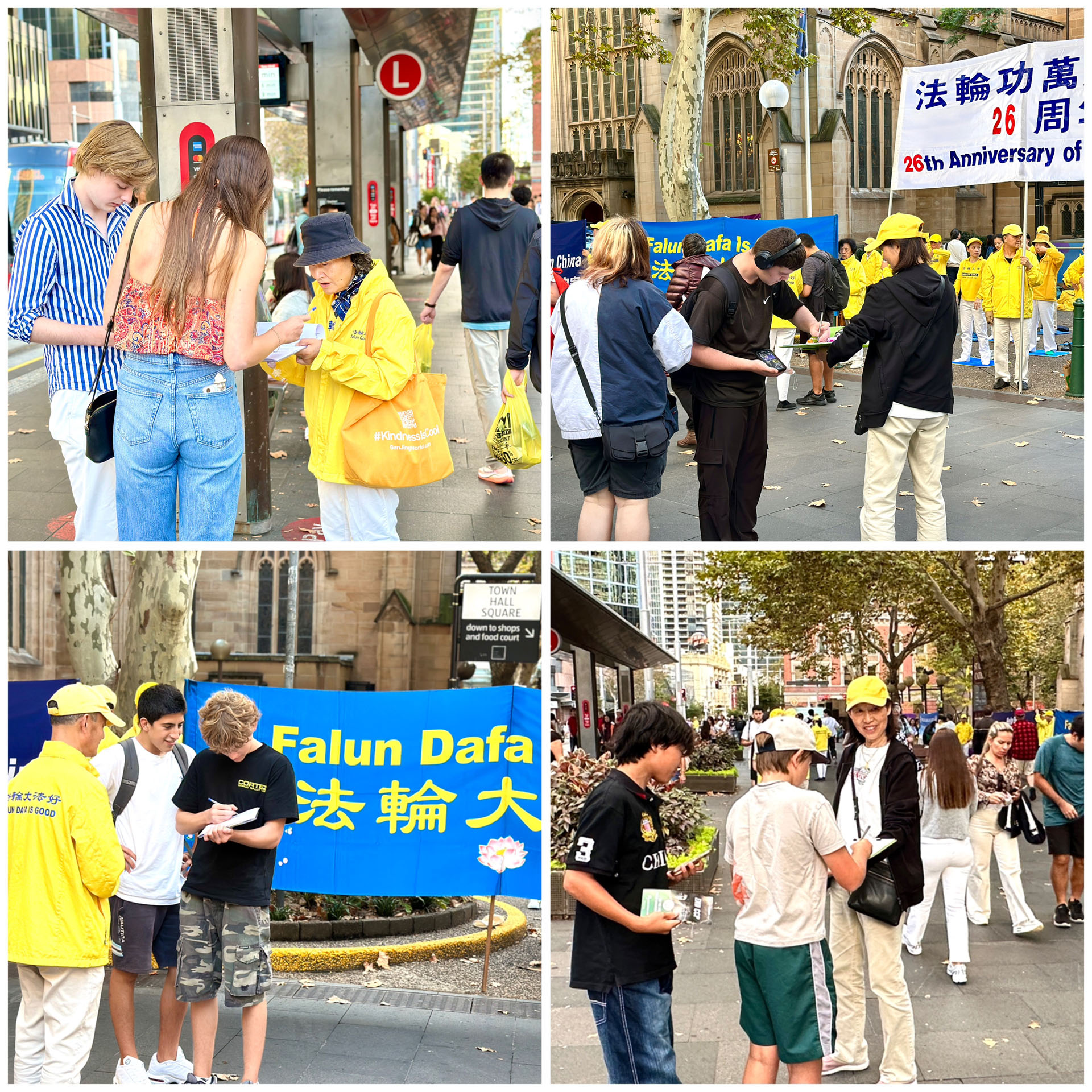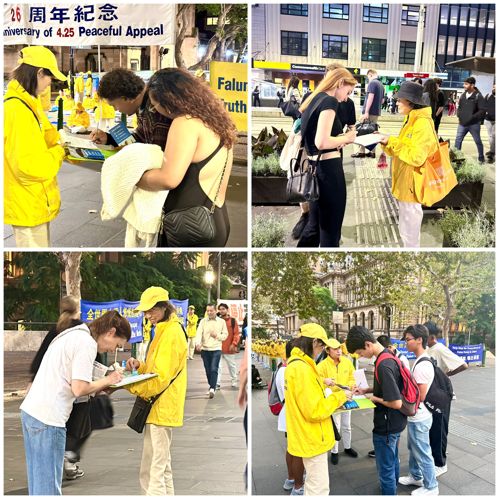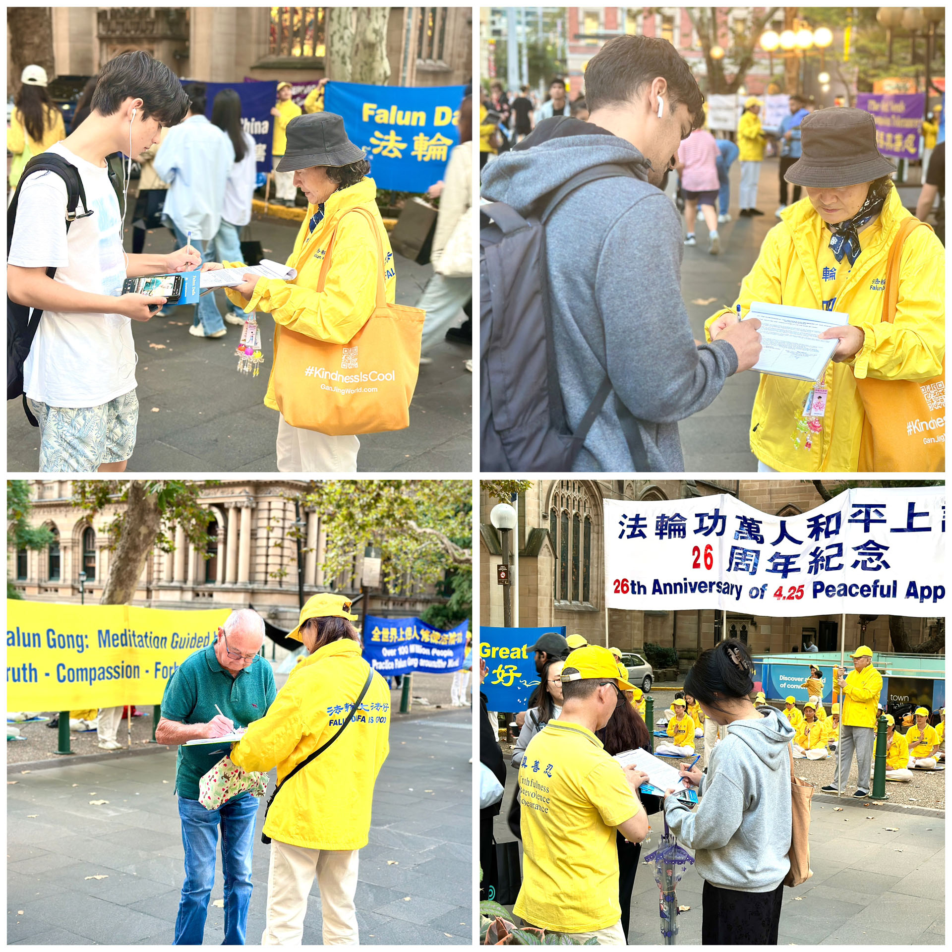 悉尼民众反响热烈,他们对法轮功学员坚韧不拔、以慈悲又智慧的方式持续向社会祥和讲真相的精神表示崇敬和高度赞扬;他们期望法轮功学员持之以恒,让更多人了解真相、觉醒良知,最终获胜的将是法轮功。有的悉尼民众表示:四·二五逾万名法轮功学员的和平请愿非常勇敢,令人钦佩;有的表示我支持法轮功学员有权利实践自己的信仰;有的还表示我们需要一起努力传播真相,为我们的子孙后代争取和实践人权和信仰自由的权利。