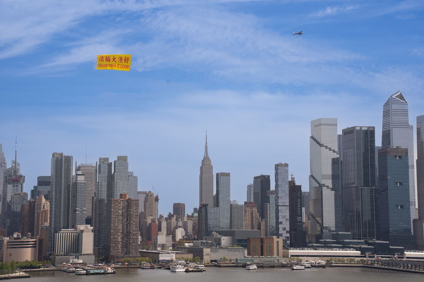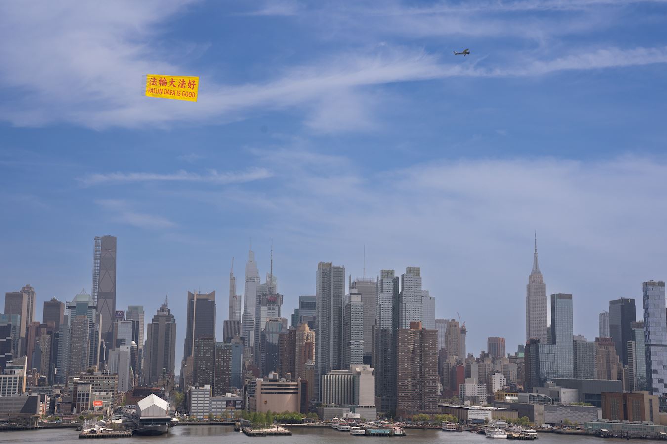 ![]() 图1~2:二零二五年四月二十五日,“法轮大法好”(FALUN DAFA IS GOOD)巨型中英文横幅在曼哈顿的哈德逊上空飘扬。 |