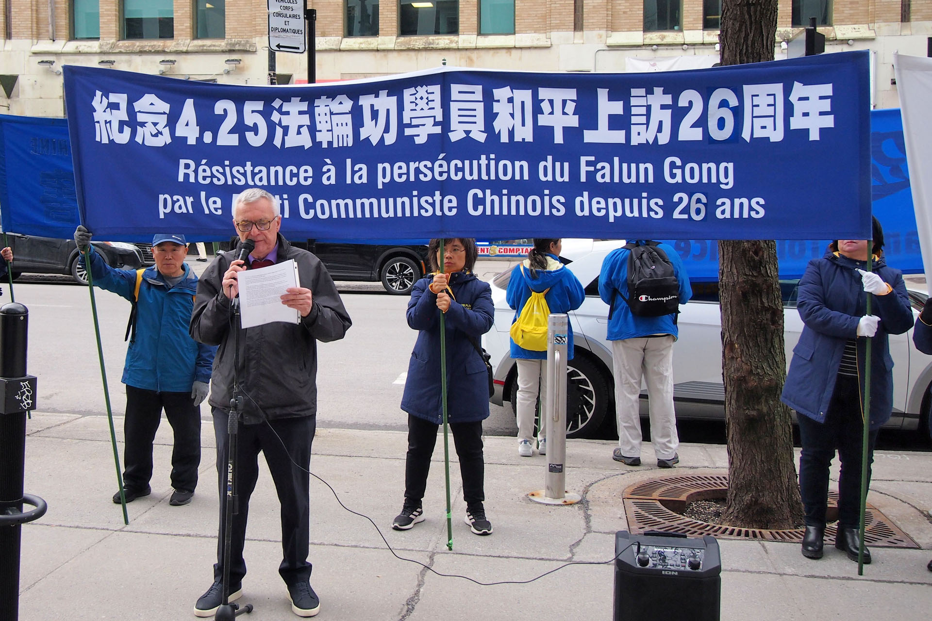 参加当日集会活动的法轮功学员罗娜(Lorna),在二十六年前的四月二十五日,前往中共驻加拿大大使馆反映情况。当天上午她在炼功点上得知了天津法轮功学员被中共警察抓捕的消息,就抱着朴素的一念:让中国政府了解法轮功的真实情况,和一些法轮功学员坐上了从蒙特利尔开往渥太华的大巴。