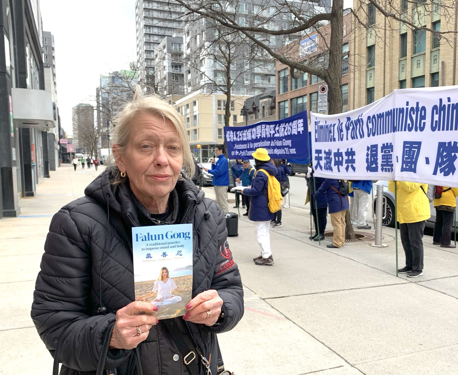 ![]() 图3:蒙特利尔市民沙戎・布莱恩(Sharon Brien)对法轮功学员表示支持。 |