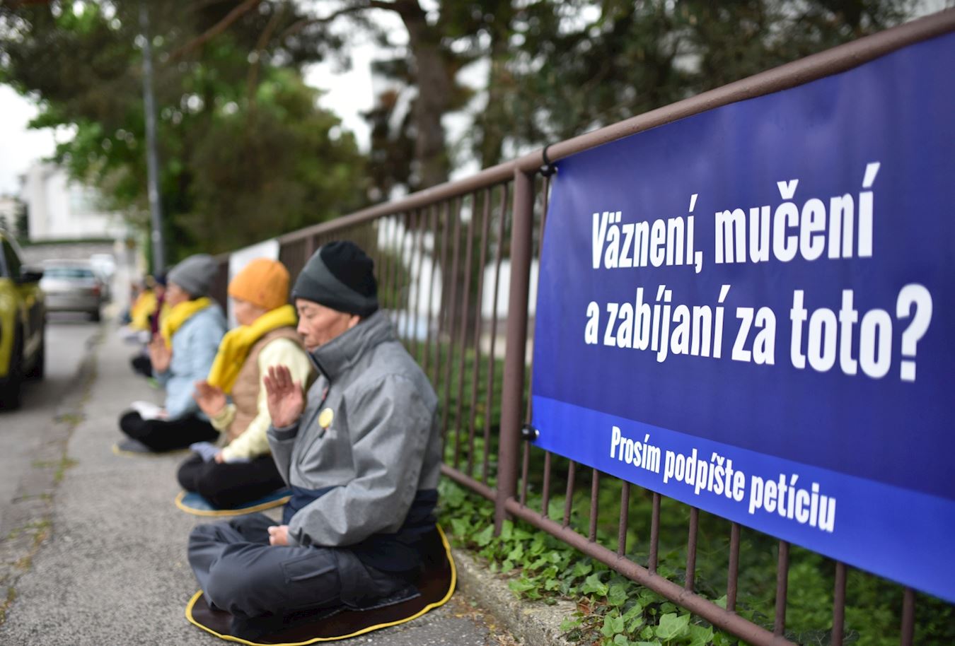 ![]() 图1:二零二五年四月二十四日,斯洛伐克部分法轮功学员在布拉迪斯拉伐中共大使馆前,纪念北京“四・二五”和平上访。横幅上写着:“因为这样被关押、酷刑、致死?请签名支持。” |