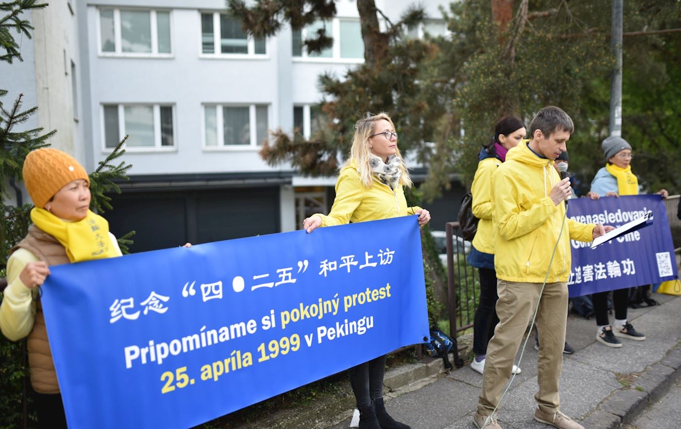 ![]() 图2:二零二五年四月二十四日,斯洛伐克法轮大法学会主席马雷克・塔塔尔科(Marek Tatarko)在布拉迪斯拉伐中共大使馆前发言,纪念北京“四・二五”和平上访。 |