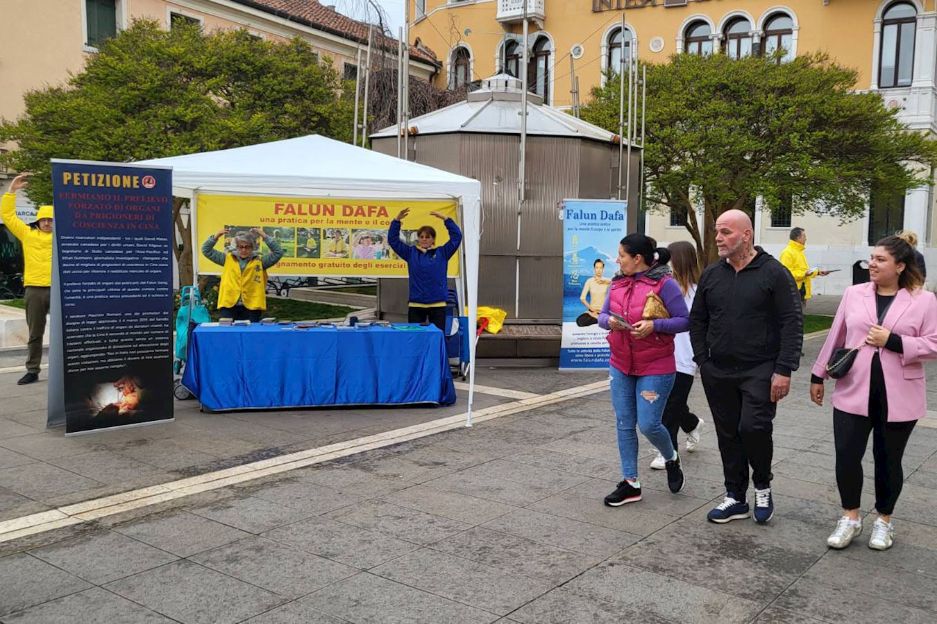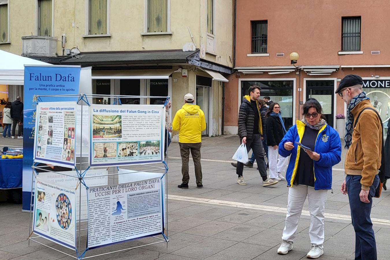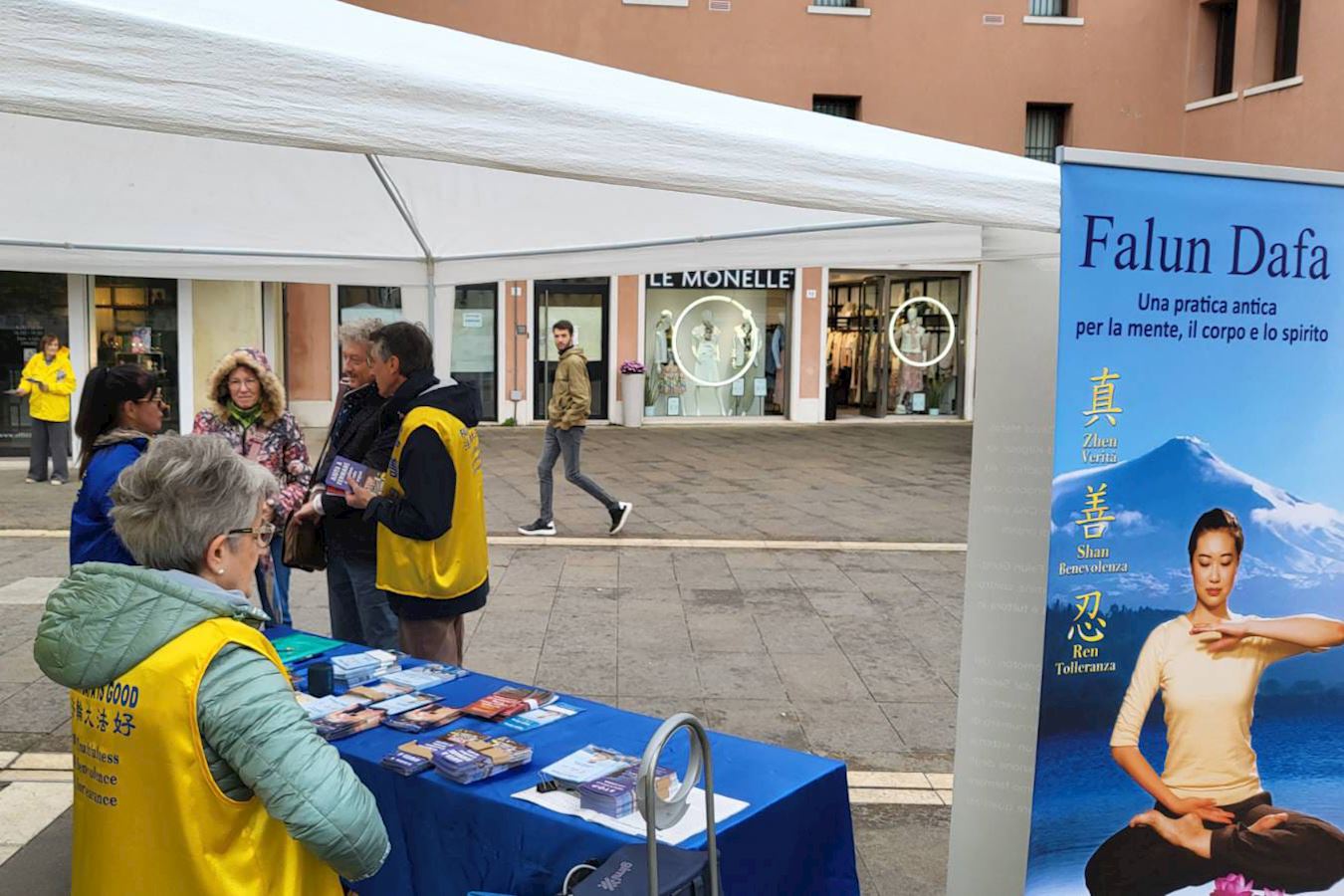 四月十三日星期日,法轮功学员在威尼托大区梅斯特雷城(Mestre)市中心,马泰拉广场(Piazza Mattera)举行活动,纪念四・二五万人和平上访。